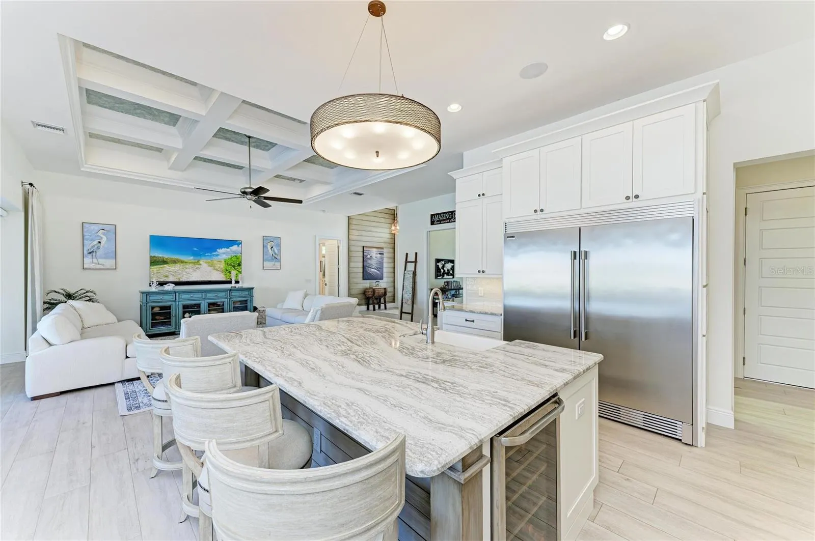 The open-concept great room features exquisite coffered ceilings, custom trim, and designer finishes throughout. The gourmet kitchen is a chef’s dream, with Cambria quartz countertops, custom wood cabinetry, soft-close drawers, and premium appliances, all beautifully blending functionality and style. A den/study provides a flexible space for guests or a home office.