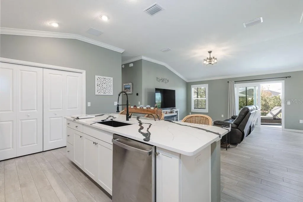 WELCOME HOME! MINUTES FROM “EVERYTHING EASTPORT!” This is a must see home! This beautifully upgraded 2/2 Topaz Model Patio Villa WITH A VERY RARE 2 FULL CAR GARAGE is located in the highly desirable Brody Villas of the Village of Moultrie Creek. This home is less than 2 years old and has been extensively upgraded with more than $70,000 in improvements and premium upgrades completed within the last 18 months, including a full birdcage addition, Sherwin-Williams 2022 Color of the Year professionally painted interior paint, upgraded landscaping, paver driveway, granite countertops throughout, custom tile backsplash, glass shower door, upgraded stained glass front door, whole home black 6″ gutters, new ceiling fans, epoxy-coated garage floor, and so much more. The home also features vaulted ceilings with crown moulding, interior laundry, a matching screened front lanai, and a premium CORNER OVERSIZED lot offering enhanced privacy and SPACE. NO KISSING LANAI HERE!