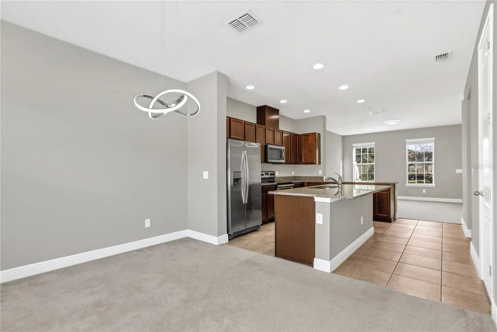 Step inside to an inviting open-concept first floor featuring a spacious living and dining area that flows effortlessly into the upgraded kitchen. Designed for both everyday living and entertaining, the kitchen includes stainless steel appliances, shaker cabinetry, solid-surface countertops, and a large island with comfortable seating. Natural light fills the space, highlighting the neutral palette and contemporary finishes throughout.