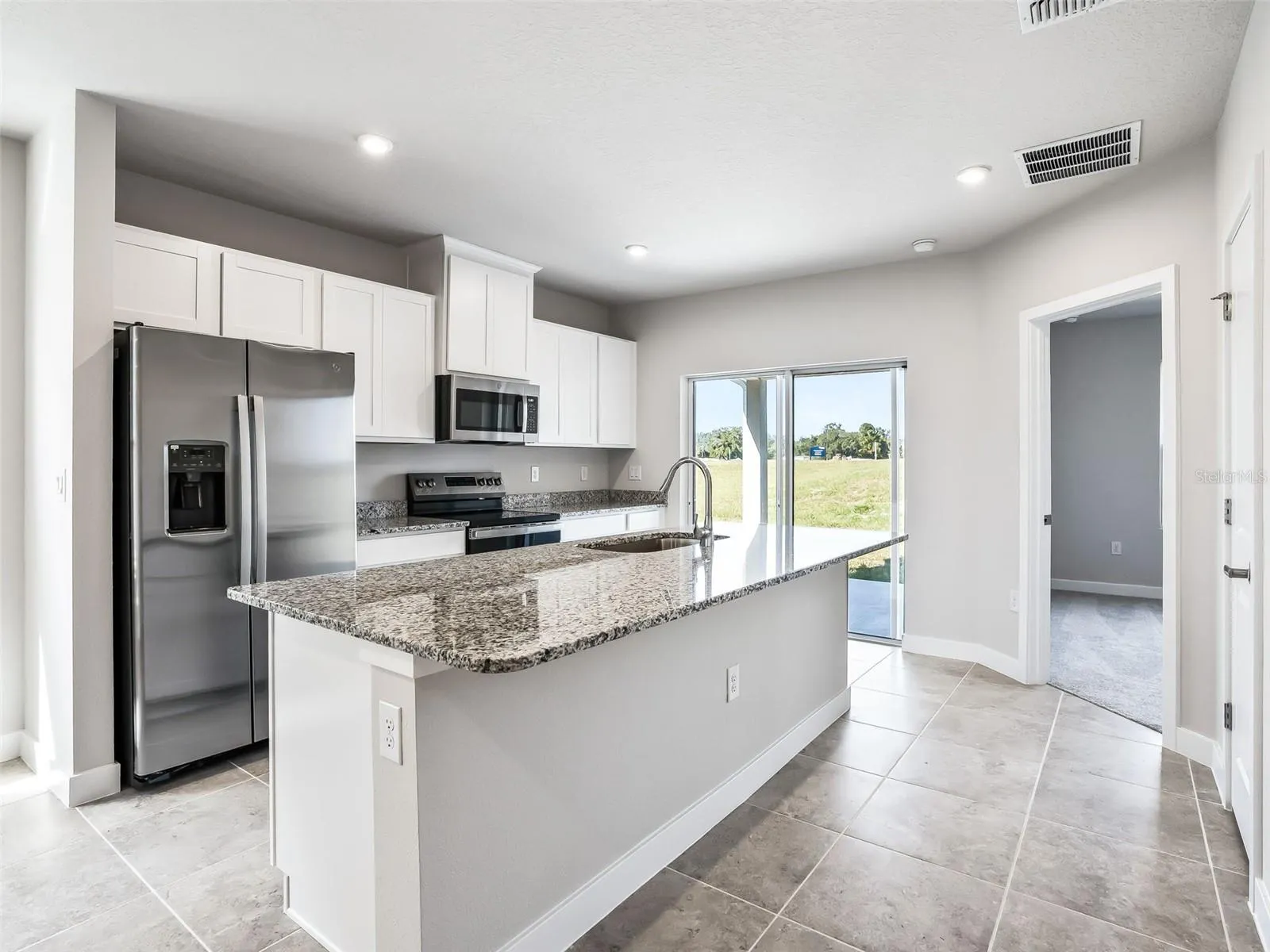 The stylish kitchen boasts granite countertops, a large breakfast bar, a dining area, and a closet pantry. Glass sliding doors lead out to the covered rear patio, ideal for relaxing or entertaining.