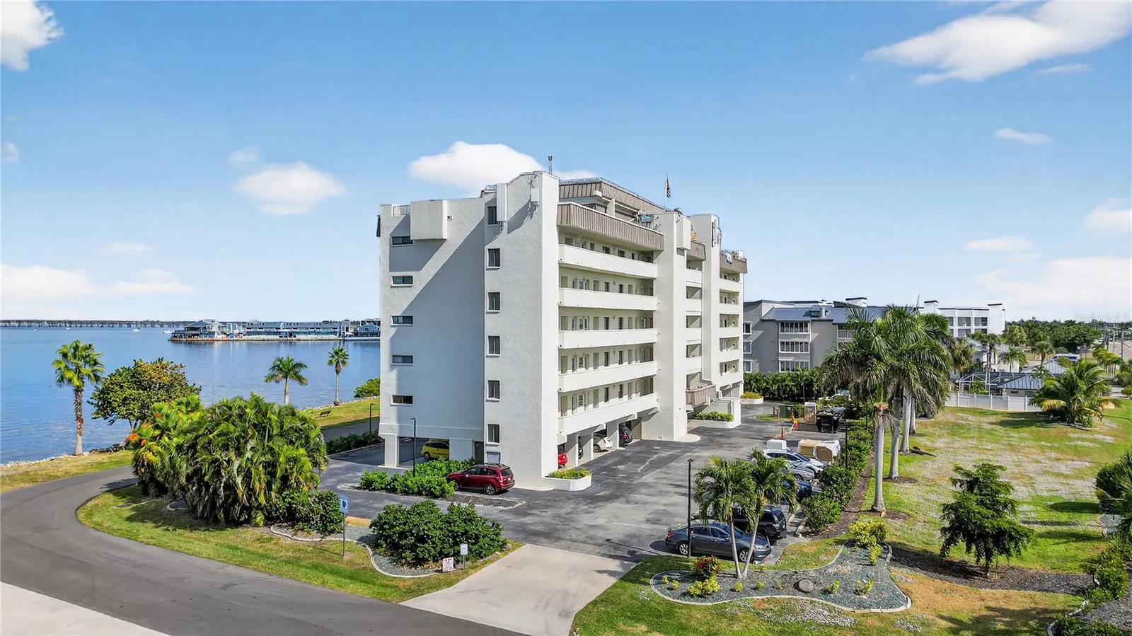 Open the door and say “WOW!” Enjoy breathtaking views of Charlotte Harbor from this beautifully updated condo on the 4th floor. Furnished TURN-KEY! (just bring your toothbrush) Resort-style amenities include a rooftop pool and clubhouse, a relaxing sauna, and easy access to the vibrant lifestyle of Punta Gorda. Convenience is key with your assigned covered parking spot (4E) with a large storage unit that’s wide and deep enough for two bicycles. In this unit, all windows and the sliding glass door have been replaced with IMPACT resistant glass, complemented by a remote-controlled hurricane shutter for added security. No closed-off kitchen here–a major remodel completely reconfigured the kitchen so that the open floorplan flows easily and allows more enjoyment of the gorgeous water view. High end custom maple cabinetry and granite countertops were installed. The remodel included TILE flooring throughout (no carpet!); modern lighting fixtures; updated bathrooms with tile showers; new sinks and toilets; and a granite vanity in the master bathroom. Recent upgrades within the past five years include a new HVAC system, air handler, and thermostat; new water heater; and a new dishwasher. A NEW ROOF is currently being installed, and the security system at the lobby is being upgraded for your peace of mind. Each floor has its own laundry room and trash chute, plus this unit has hookups for a washer and dryer in the hall closet. Imagine the convenience of being the closest to the elevator and sitting area on the balcony, yet tucked away for privacy. Fisherman’s Village Pier, Sunseeker Resort, lively downtown, and waterfront dining are close enough to enjoy everyday. Don’t pass up the opportunity to own a move-in-ready home with stunning views and top-notch amenities in one of Florida’s most desirable waterfront communities.