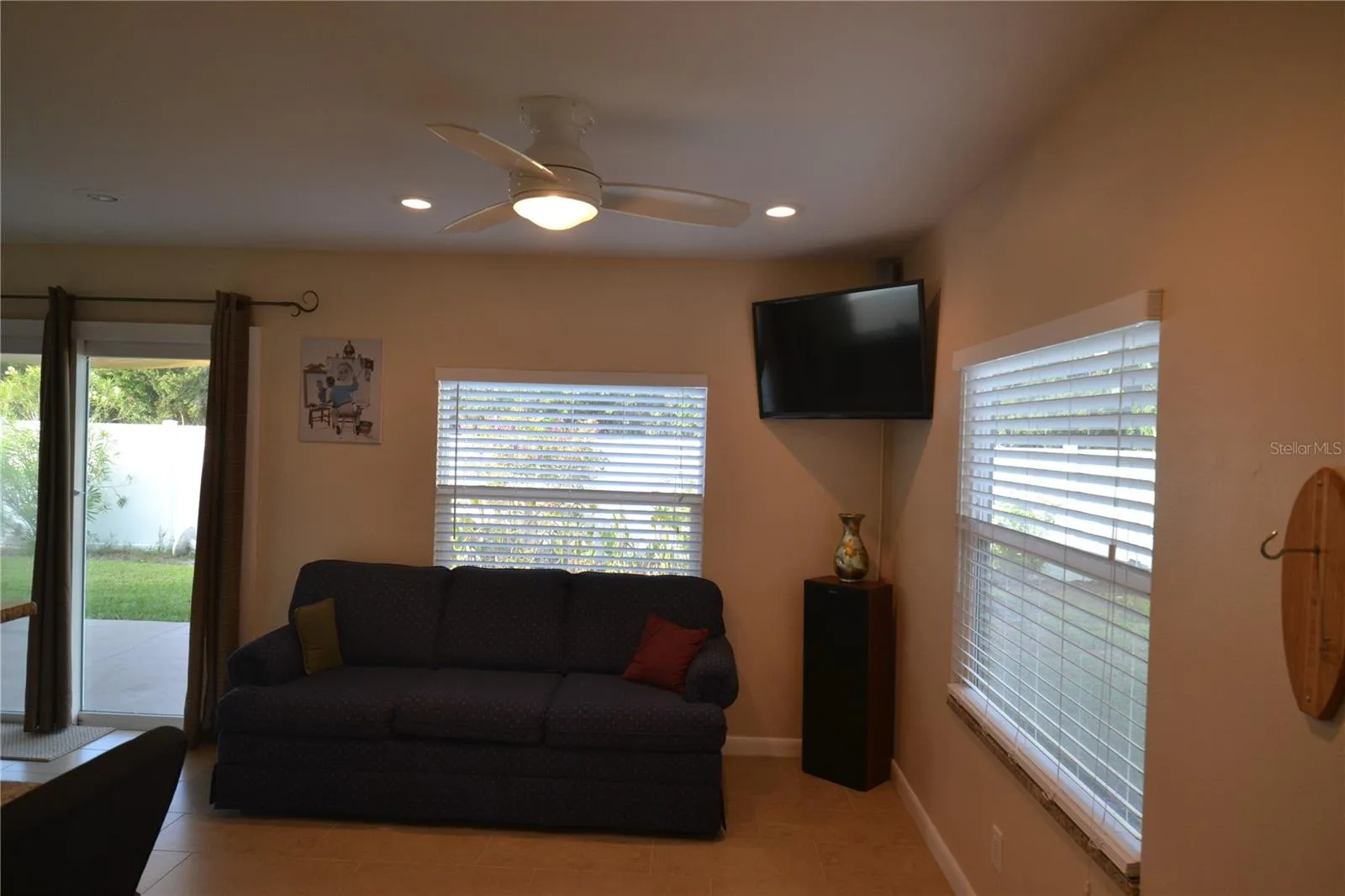 Experience comfortable short-term Florida living in this beautifully furnished single-family vacation home featuring 2 bedrooms, 2 bathrooms, and a spacious 2-car garage. Thoughtfully designed and impeccably maintained, this residence offers a desirable split-bedroom floor plan, complemented by both a formal living room and a generous family room—ideal for relaxing or entertaining. The enclosed, climate-controlled lanai provides an inviting year-round retreat and features two additional TVs for your enjoyment. The kitchen, showcasing beautiful quartz countertops, opens to both the family room and the lanai, creating a natural flow throughout the home. The family room is furnished with comfortable loungers and includes one of the home’s TVs, perfect for unwinding after a day of exploring.