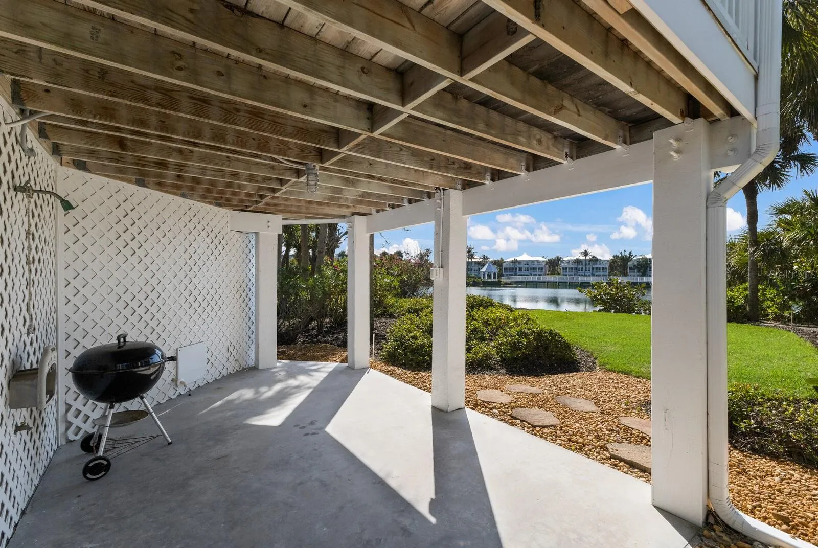 Upstairs, the primary suite opens to a private sundeck ideal for enjoying soft Gulf breezes, serene water vistas, and dramatic evening skies. Two additional bedroom suites, each with a fully renovated bath, ensure comfort and privacy for family and guests. A ground-level lakeside patio offers another relaxed outdoor setting, enhanced by the generous and private feel of the end-unit location—an ideal spot for grilling and complete with a convenient outdoor shower area for rinsing off after a day at the beach.