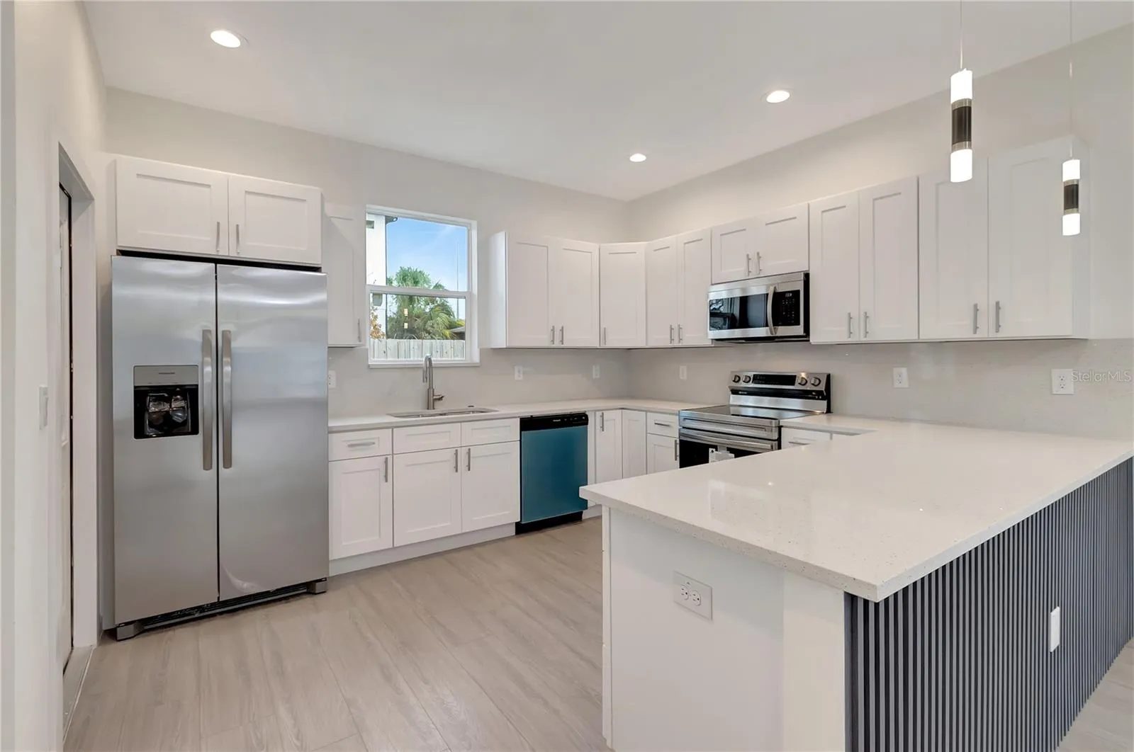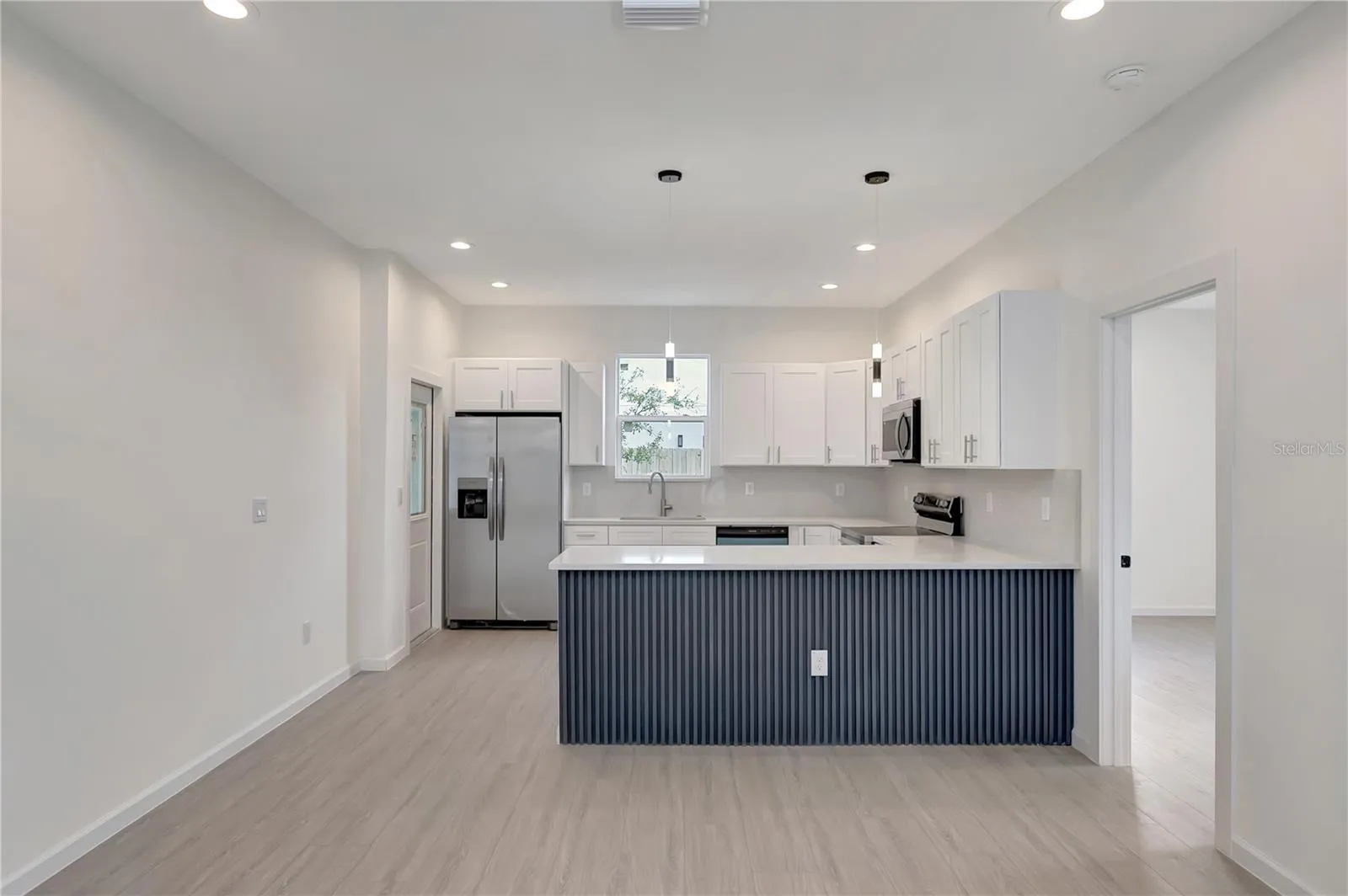 Inside, you’ll appreciate the seamless flow created by water-resistant vinyl plank flooring throughout and soaring 9′ ceilings. The gourmet kitchen truly serves as the centerpiece of the home, boasting 36″ shaker cabinetry, elegant quartz countertops, a full quartz backsplash, and a complete suite of brand-new stainless steel appliances (Range, dishwasher, microwave and Refrigerator. It’s a beautifully designed space perfect for everyday living as well as entertaining.