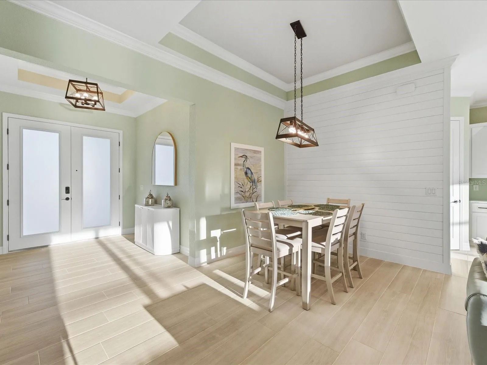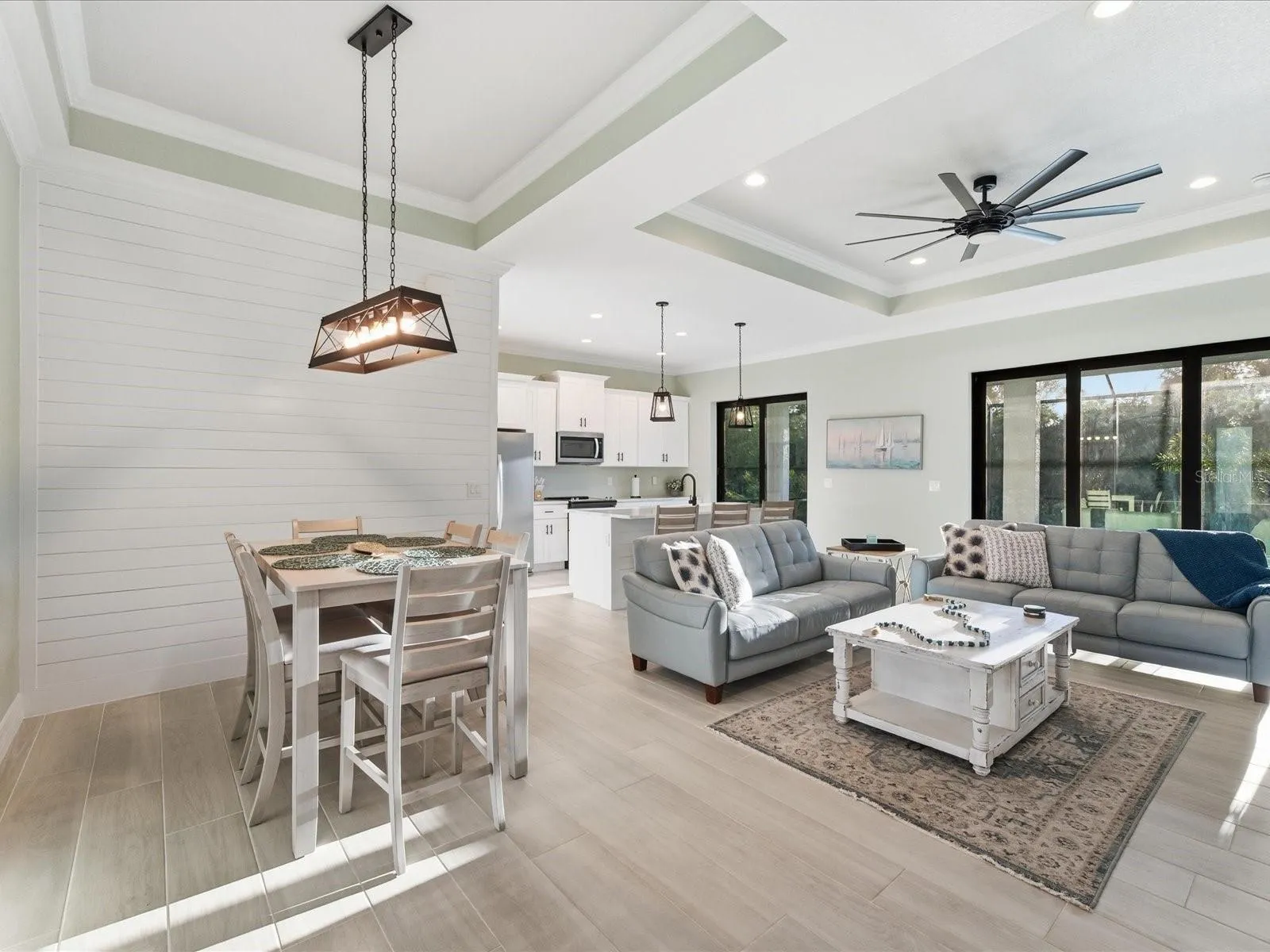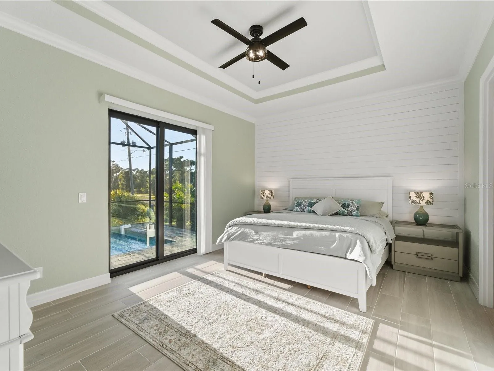 Step inside to soaring volume ceilings, 8-foot interior doors, and elegant porcelain plank flooring throughout. The living room features a striking tray ceiling with recessed lighting, a 6’ ceiling fan, and a 3-panel sliding glass door that opens gracefully to the 26’ covered lanai, delivering the seamless indoor-outdoor lifestyle Florida is known for. At the heart of the home, the chef’s kitchen offers solid wood, soft-close cabinetry, gorgeous granite countertops, stainless steel appliances, a walk-in pantry, and its own sliding glass door leading directly to the lanai—an ideal layout that enhances natural light, flow, and convenience. Shiplap accents elevate the kitchen island, dining room, and primary bedroom, adding warmth and designer appeal. With open sightlines and direct pool access, this home is ideal for both entertaining and everyday living.