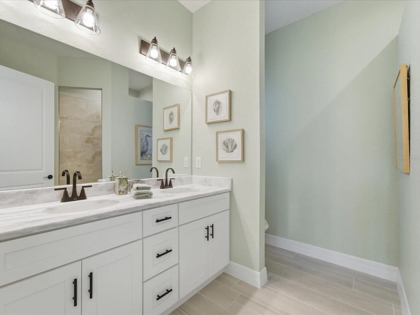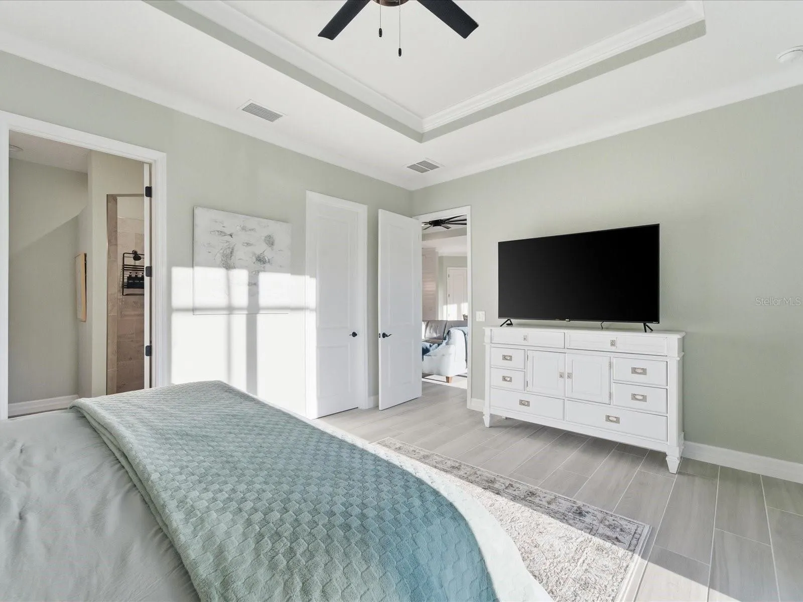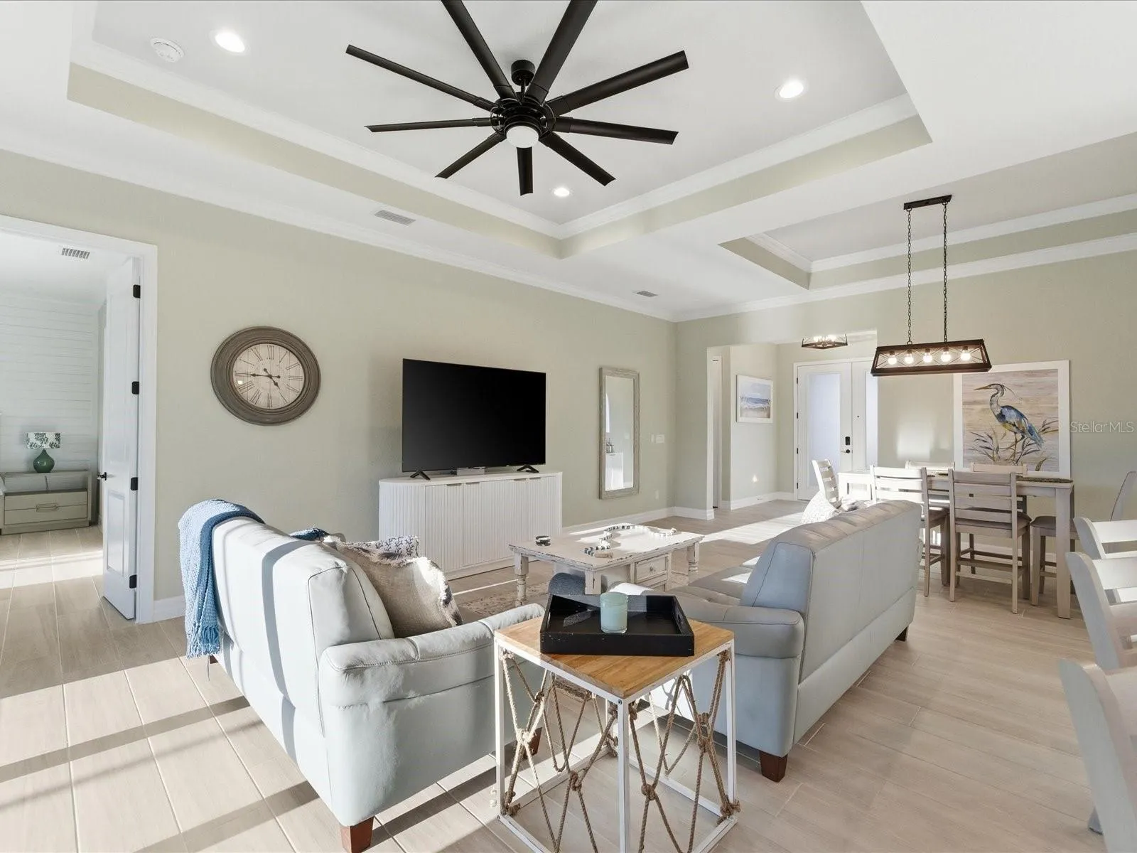 Step inside to soaring volume ceilings, 8-foot interior doors, and elegant porcelain plank flooring throughout. The living room features a striking tray ceiling with recessed lighting, a 6’ ceiling fan, and a 3-panel sliding glass door that opens gracefully to the 26’ covered lanai, delivering the seamless indoor-outdoor lifestyle Florida is known for. At the heart of the home, the chef’s kitchen offers solid wood, soft-close cabinetry, gorgeous granite countertops, stainless steel appliances, a walk-in pantry, and its own sliding glass door leading directly to the lanai—an ideal layout that enhances natural light, flow, and convenience. Shiplap accents elevate the kitchen island, dining room, and primary bedroom, adding warmth and designer appeal. With open sightlines and direct pool access, this home is ideal for both entertaining and everyday living.