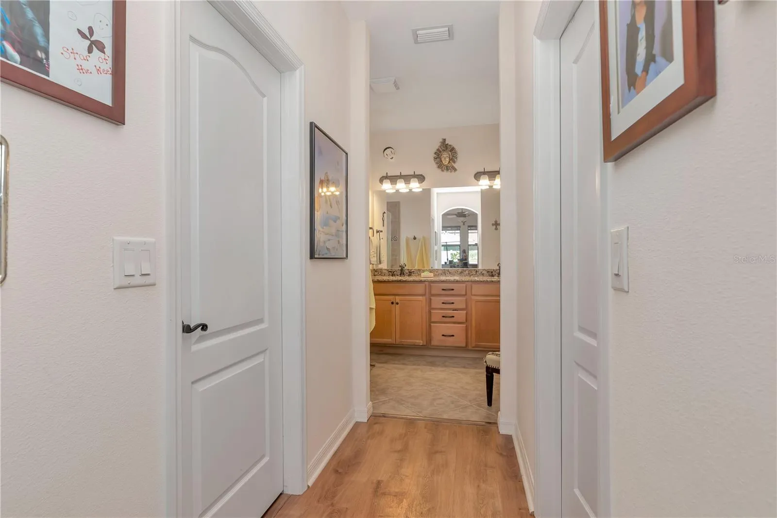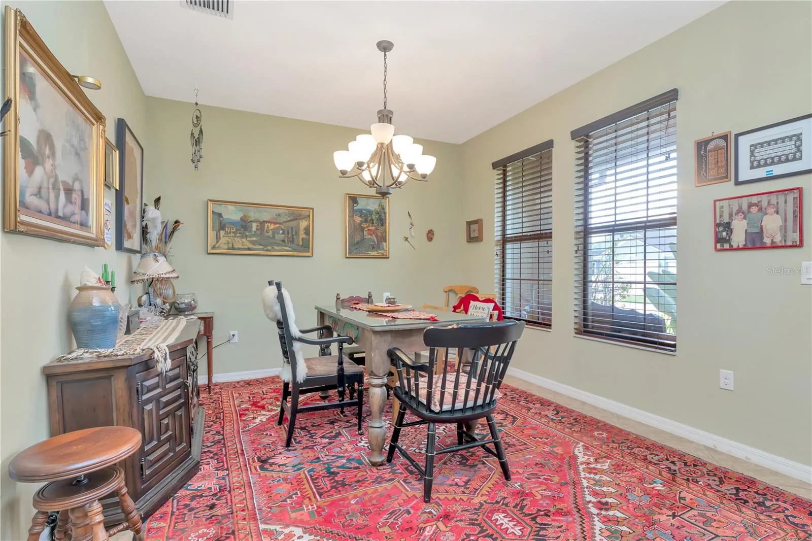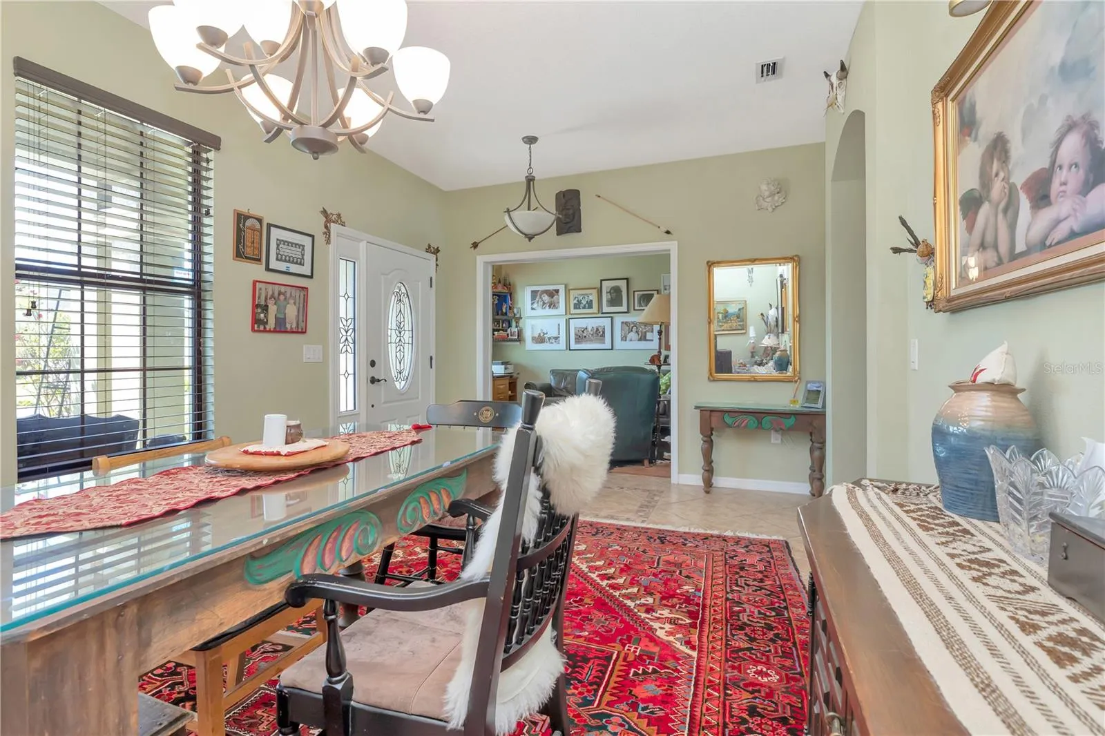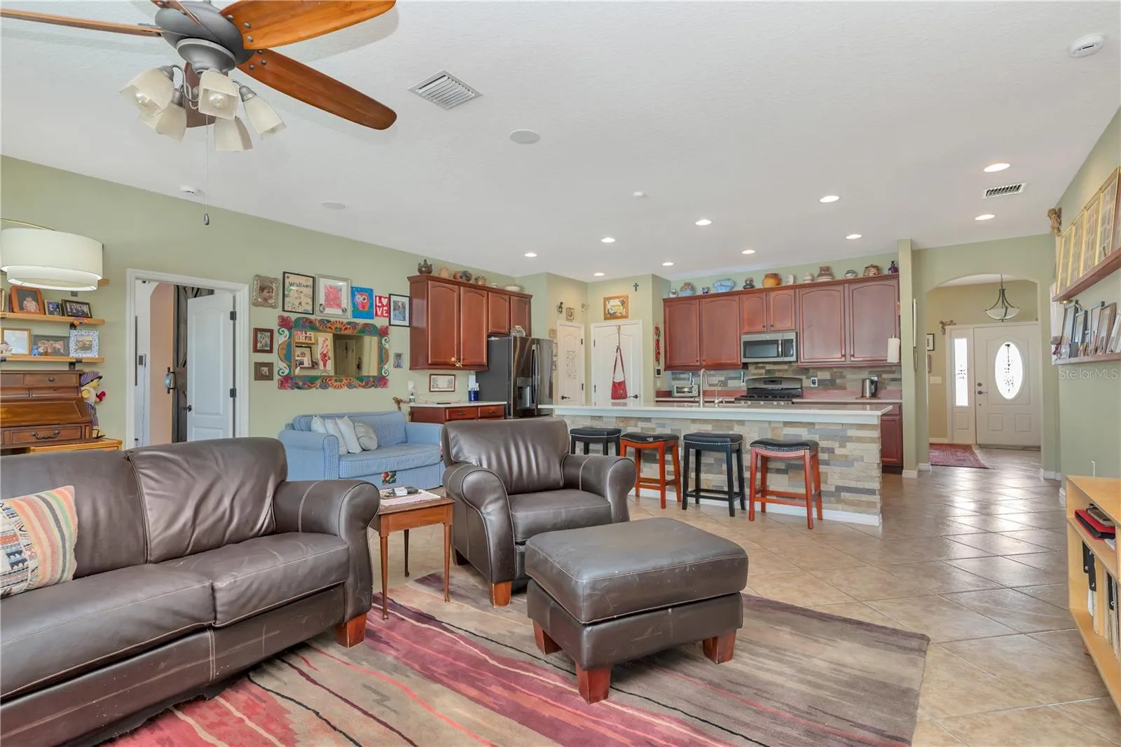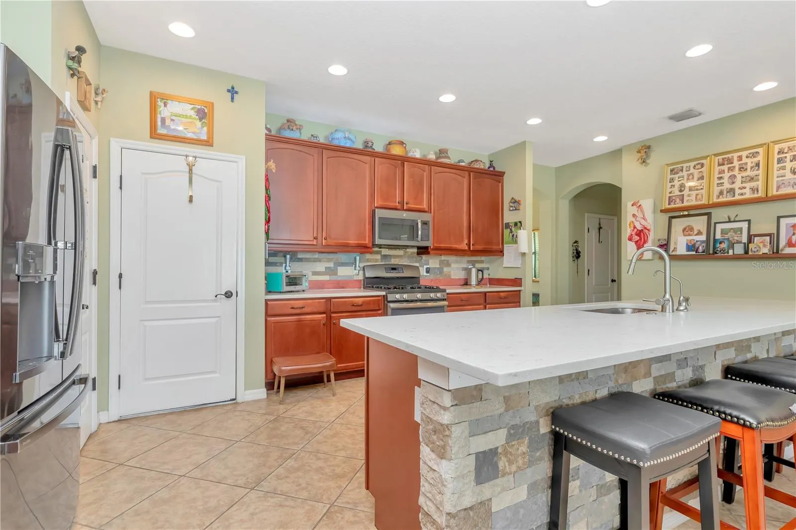 Welcome to your dream home! This stunning single-story residence features a sparkling *SALTWATER POOL* *LOW HOA* and *NO CDD fees* Built in 2014 and featuring 3 bedrooms, 2 full bathrooms, and a versatile flex space ideal for a home office, den, or hobby room. Step inside and immediately notice the pride of ownership and meticulous landscaping that set the tone for this beautifully maintained home. A charming covered front porch welcomes you in, where natural light floods the open floor plan and showcases the inviting pool view. There’s **NO CARPET** anywhere—with elegant tile laid in a diamond pattern throughout the main living areas and newer, stylish luxury vinyl plank flooring in all bedrooms!! The formal dining room provides ample space for gatherings and entertaining. At the heart of the home is a chef’s kitchen, featuring a massive center island with a stone feature that overlooks the living room and backyard. You’ll also find stainless steel appliances, 42” upper cabinets with crown molding, a gas range, upgraded quartz countertops, an undermount sink, and a spacious pantry. The primary suite is generously sized and includes a stylish barn door, private access to the screened lanai, and two walk-in closets. The en suite bathroom offers a large shower, dual vanities, and a private water closet. Step outside to your own private oasis—perfect for entertaining or simply relaxing in the Florida sunshine. The backyard features a saltwater PebbleTec pool, paver deck, screen enclosure, under roof shaded area, built in gas grill connection with the grill in place, and is fully fenced with a premium vinyl fence for privacy. This home truly combines comfort, functionality, and outdoor living at its best—ready for you to move in and enjoy! Enjoy nice upgrades like a newer A/C (2022), water softener system, irrigation system front and back, and solar panels that provide incredible savings!! You’re a short distance to schools, shopping, dining, and with quick access to major roadways like I-4, within 45 minutes to Tampa International Airport, and within an hour to the theme parks in Orlando!!