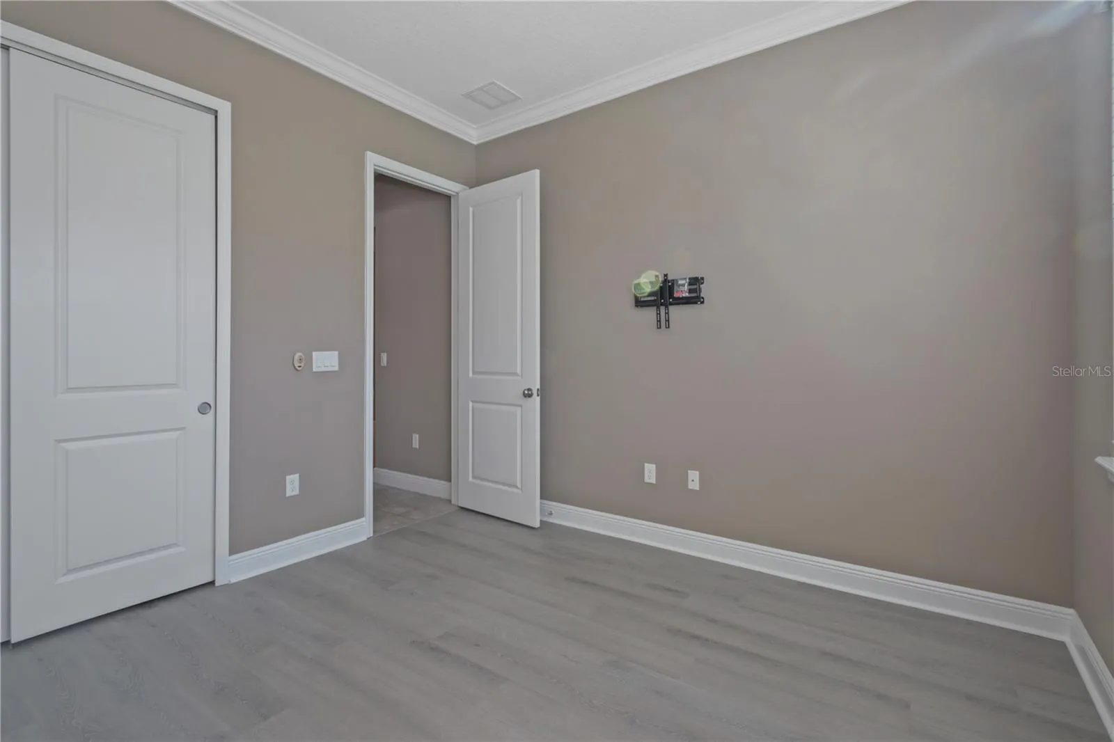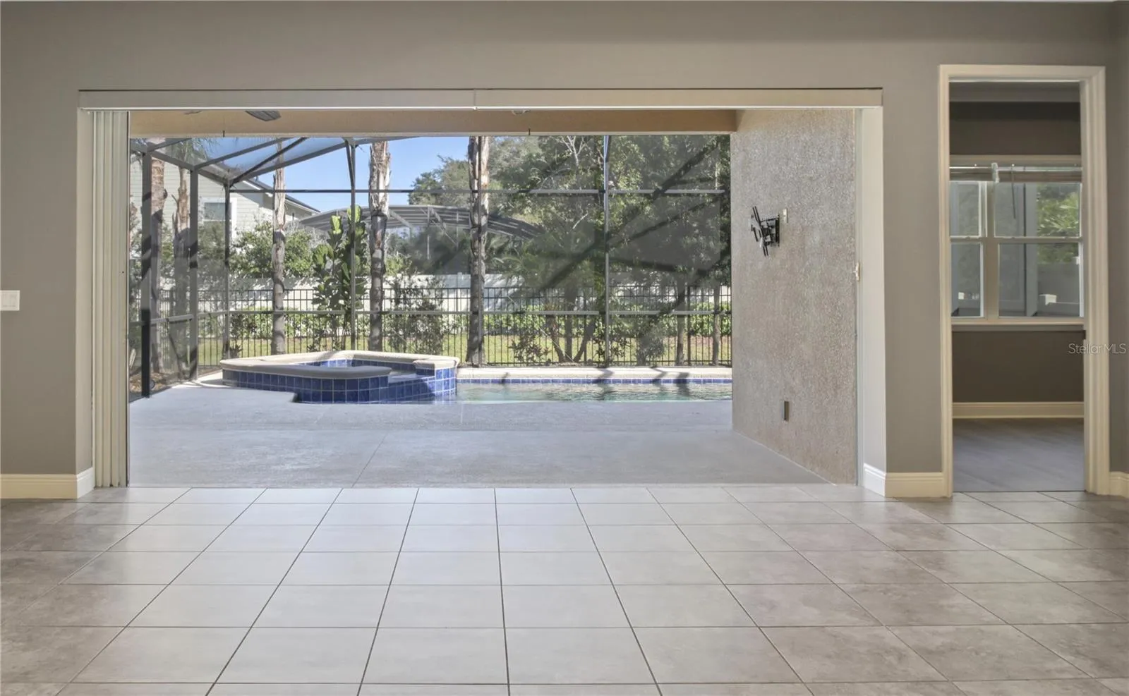 Welcome to this beautifully maintained, one-owner custom home that truly has it all. From the moment you enter, you’ll appreciate the exceptional quality and craftsmanship, including upgraded 8′ interior doors, 10-foot ceilings, crown molding, and elegant tray ceilings throughout—even in the primary suite. One of the home’s most impressive features is the expansive 16-foot pocket sliding glass door that creates a seamless indoor–outdoor connection, making your private backyard oasis feel like a natural extension of your living space. Step into the custom heated pool with built-in spa, finished in luxurious PebbleTec, and enjoy the tranquil waterfall cascading from the spa into the pool. The entire screened-in lanai is surrounded by lush landscaping and enhanced by a striking outdoor LED lighting system. The fully fenced backyard overlooks a generous greenspace that enhances privacy and creates an ideal setting for pets, entertaining, or unwinding. TV wall mounts are already installed inside and on the lanai, ideal for watching the game or unwinding by the pool. The upgraded kitchen is a chef’s dream, featuring premium finishes and a gas stove, while the open-concept living area offers an inviting space for everyday living and entertaining. All bedrooms feature recently upgraded flooring, and the primary suite includes a large walk-in closet and a spa-like bathroom with a luxurious rain shower head. The home is outfitted with numerous upgrades for comfort and convenience, including motorized blinds on the sliding glass doors, ceiling fans throughout, dimmer light switches, and a full security system. Fresh interior paint including all doors adds a crisp, updated feel to every room. Practical features include an interior storage room, a tankless water heater, and a full sprinkler system covering both the front and backyard. The home also comes prewired with plumbing, gas, and electric for a future outdoor kitchen, offering excellent potential for expanded outdoor living. The garage is exceptionally functional, featuring a 240V EV outlet, a dedicated golf cart parking space, added shelving, and attic storage for additional organization and convenience.