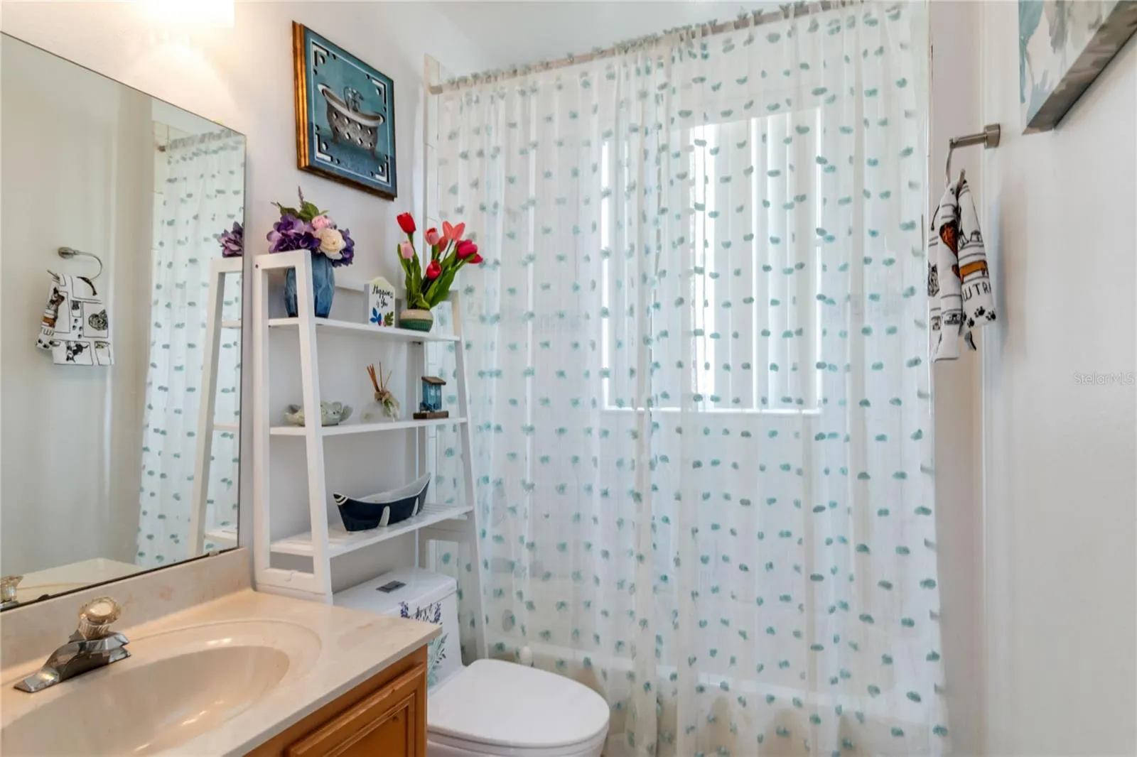 The primary bedroom is bright and airy with direct access to the patio. Its bathroom includes a jacuzzi tub, dual sinks, and a separate shower. The screened patio—enhanced in 2024 with an upgraded exterior-vented exhaust system—includes a fully functional summer kitchen perfect for outdoor dining and entertaining.