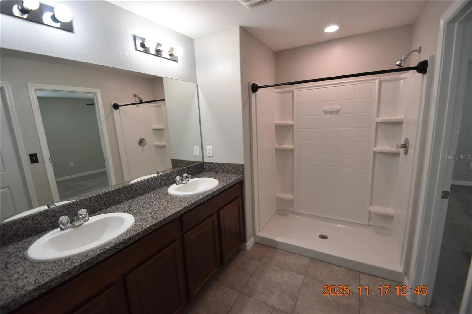 Master bathroom features double sinks & vanities and a walk-in shower.