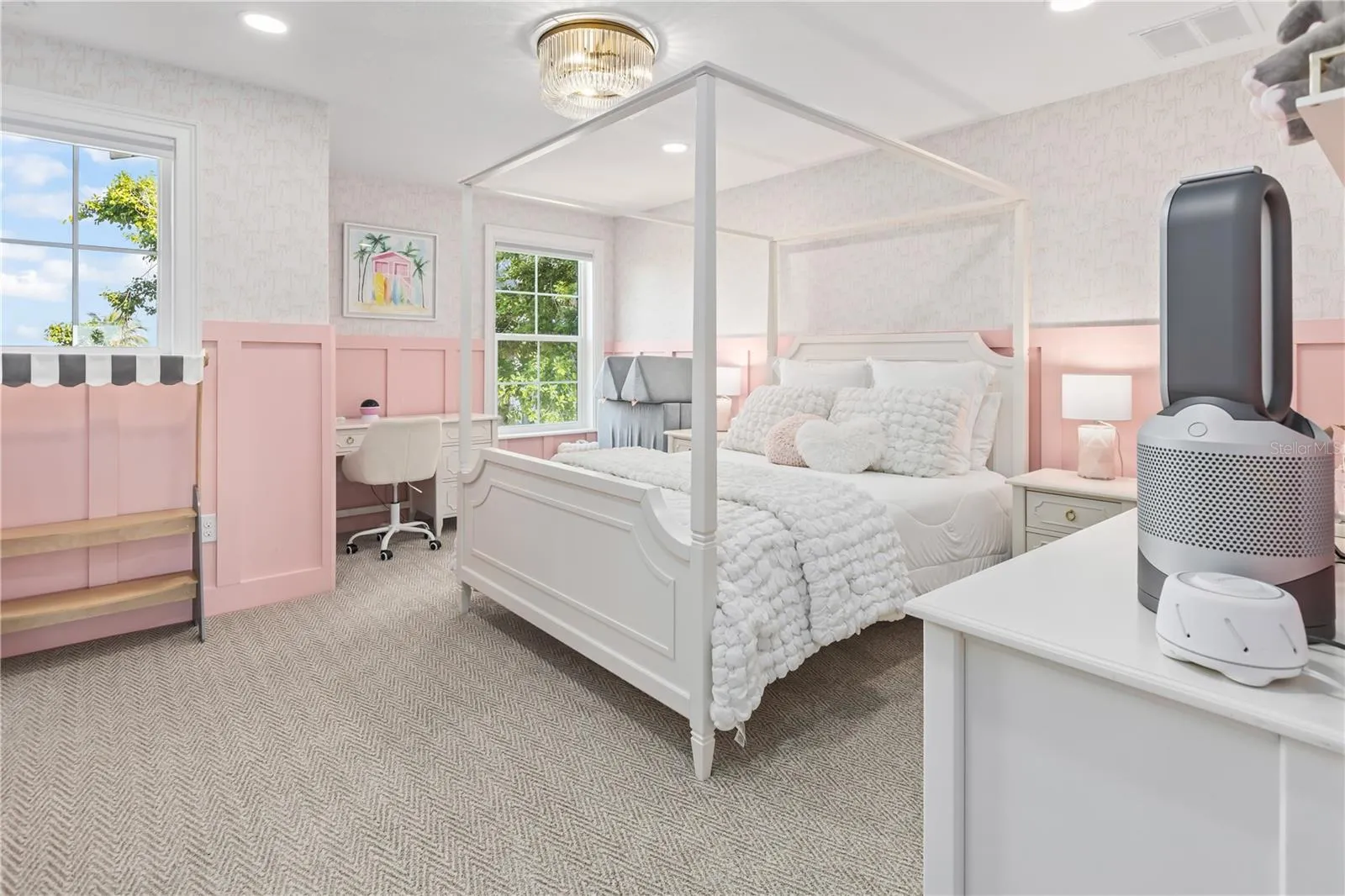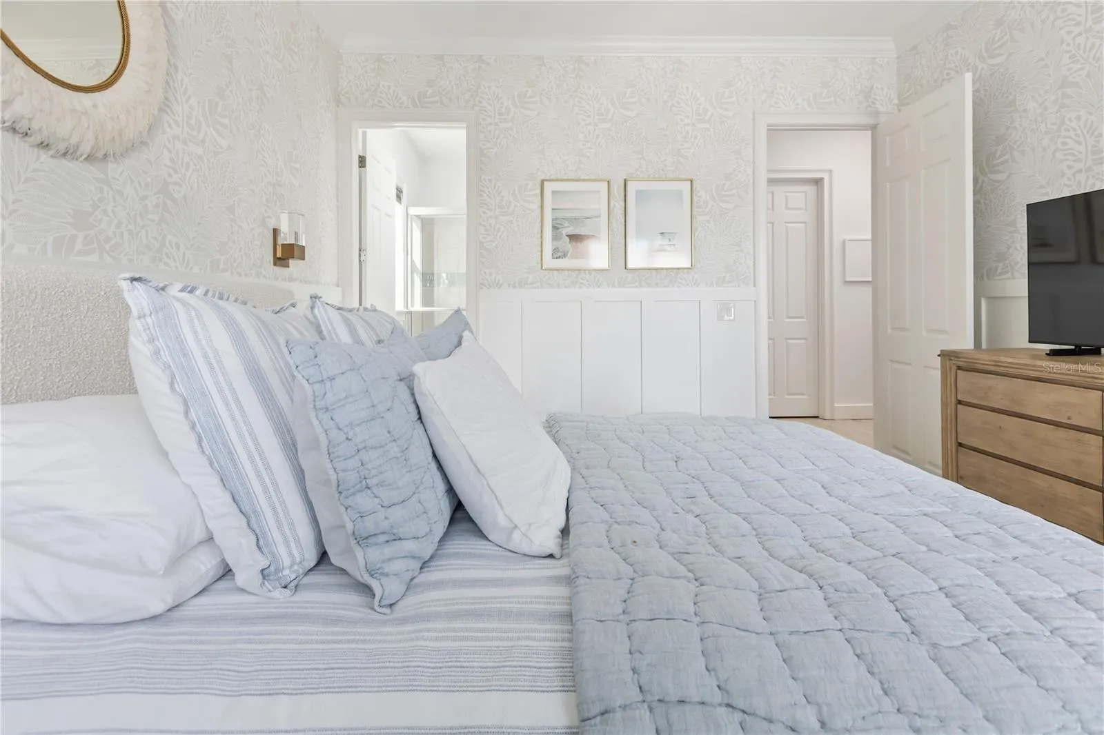 Upstairs, the guest bedrooms now feature elegant wainscoting paired with designer wallpaper, creating spaces that feel warm and thoughtfully curated. One guest bathroom has been fully remodeled, while all bathrooms throughout the home have been refreshed with upgraded lighting and new sink and shower fixtures.