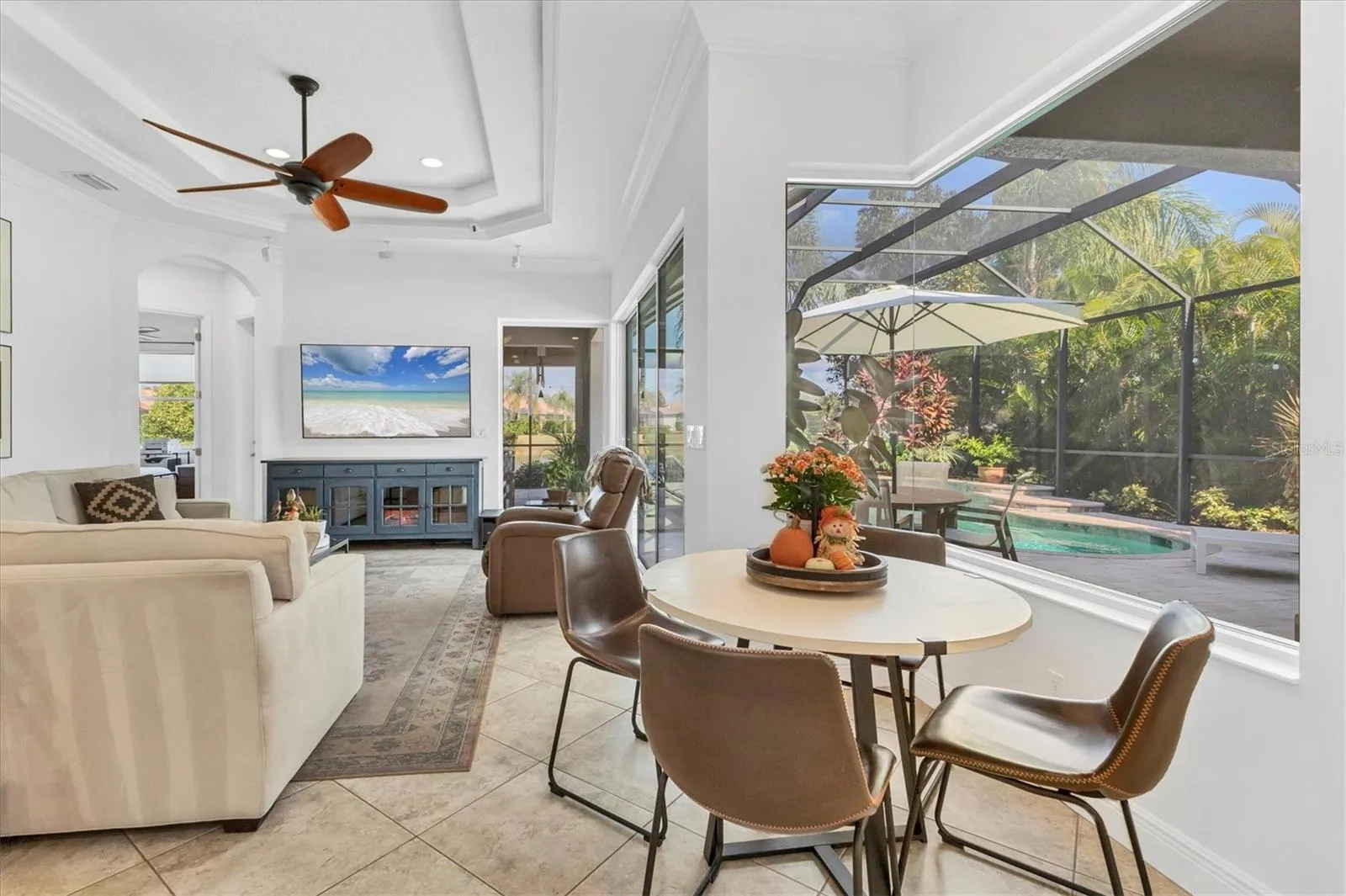 Enter into the heart of the home and soak in the expansive lake views, beautifully framed by thermal windows that bring the outdoors in. Enjoy true Florida living in the screened saltwater pool area, complete with a paver deck, built in gas grill, and refrigerator. The natural gas pool heater ensures year-round comfort.