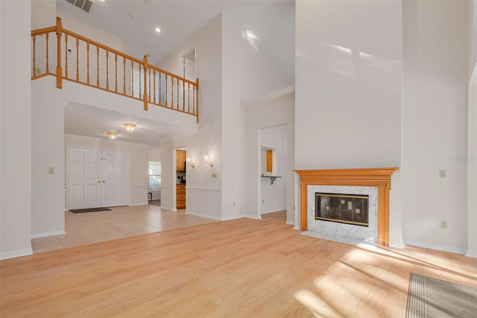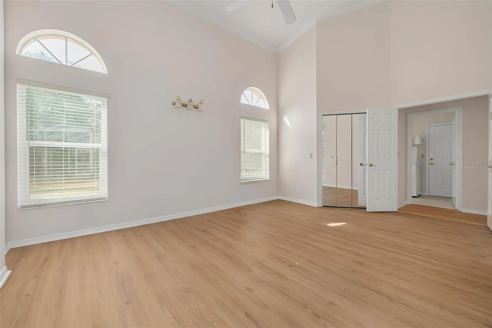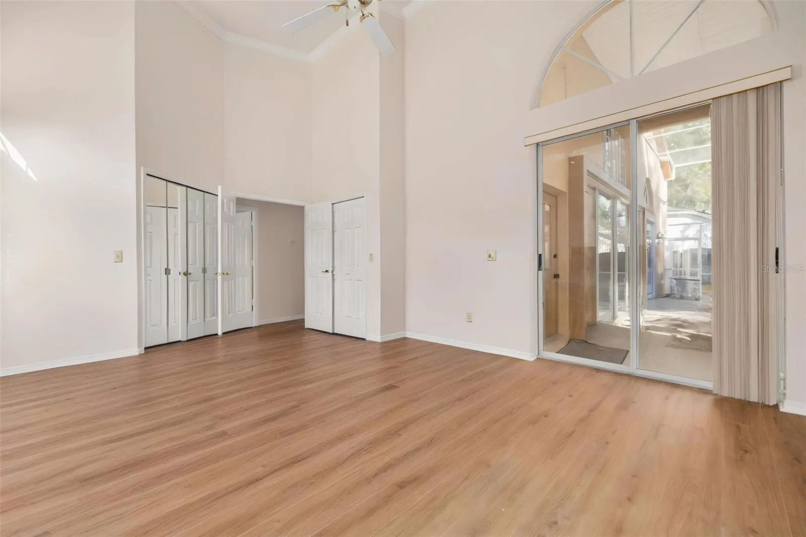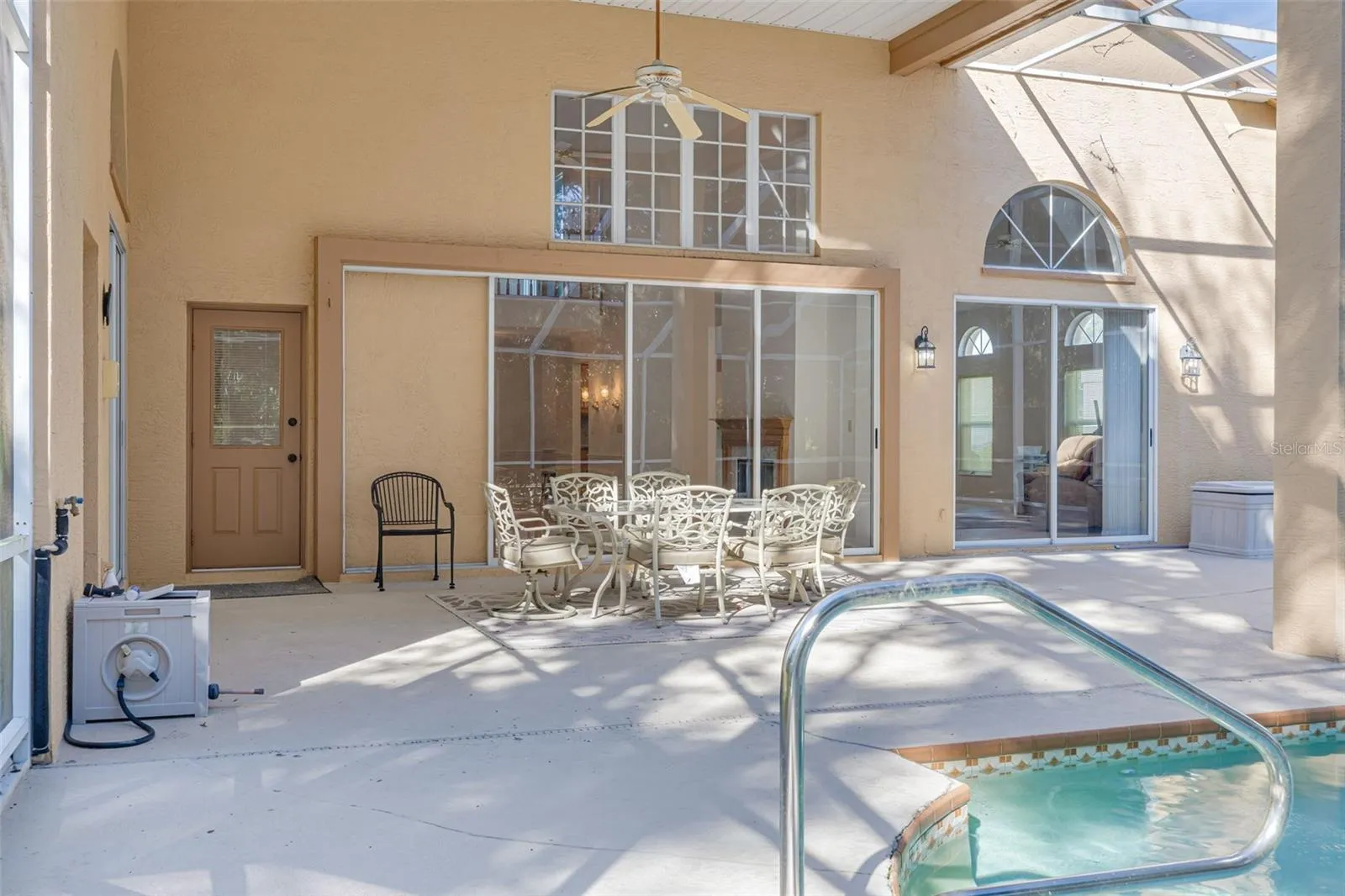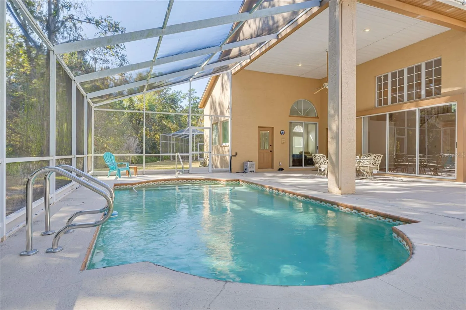 The first floor offers a large living room with fireplace, separate family room, formal dining room, and an eat-in kitchen with granite countertops. A dedicated office/den with abundant windows provides an ideal work-from-home space. Vaulted ceilings in the living room, family room, and primary suite create an open and airy feel throughout the main level. The primary bedroom is located downstairs and features two closets, direct access to the pool area, a soaking tub, and a separate walk-in shower. A full pool bath is also conveniently located on the first level.