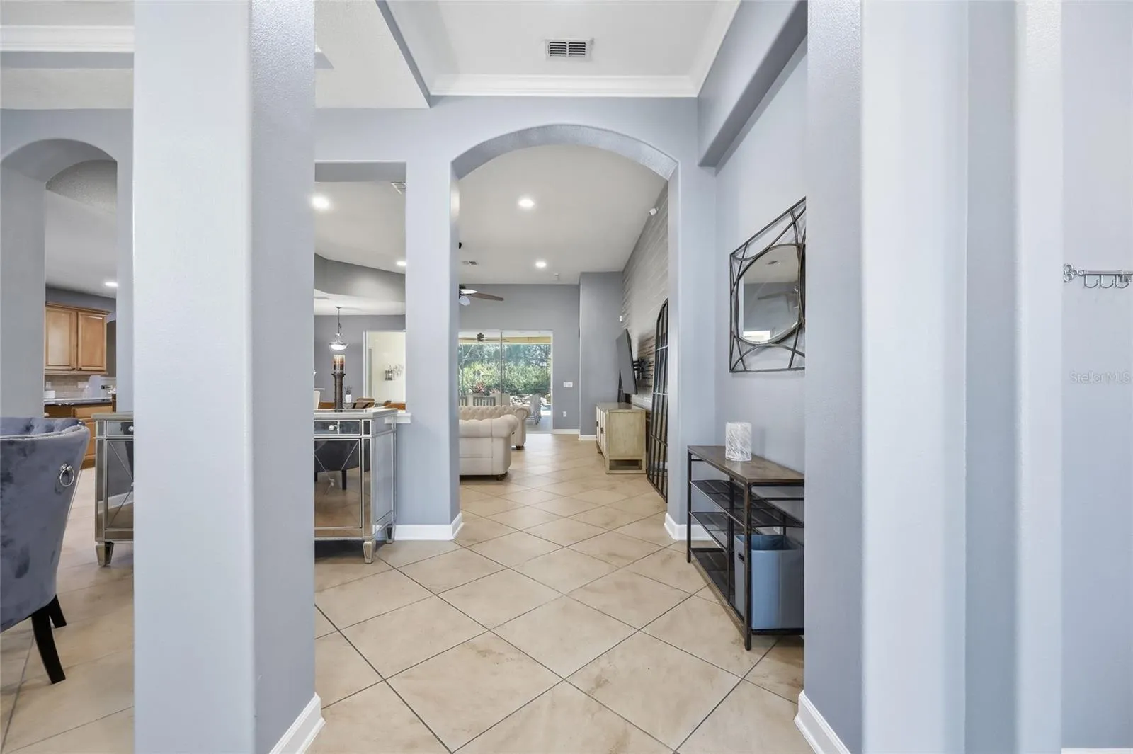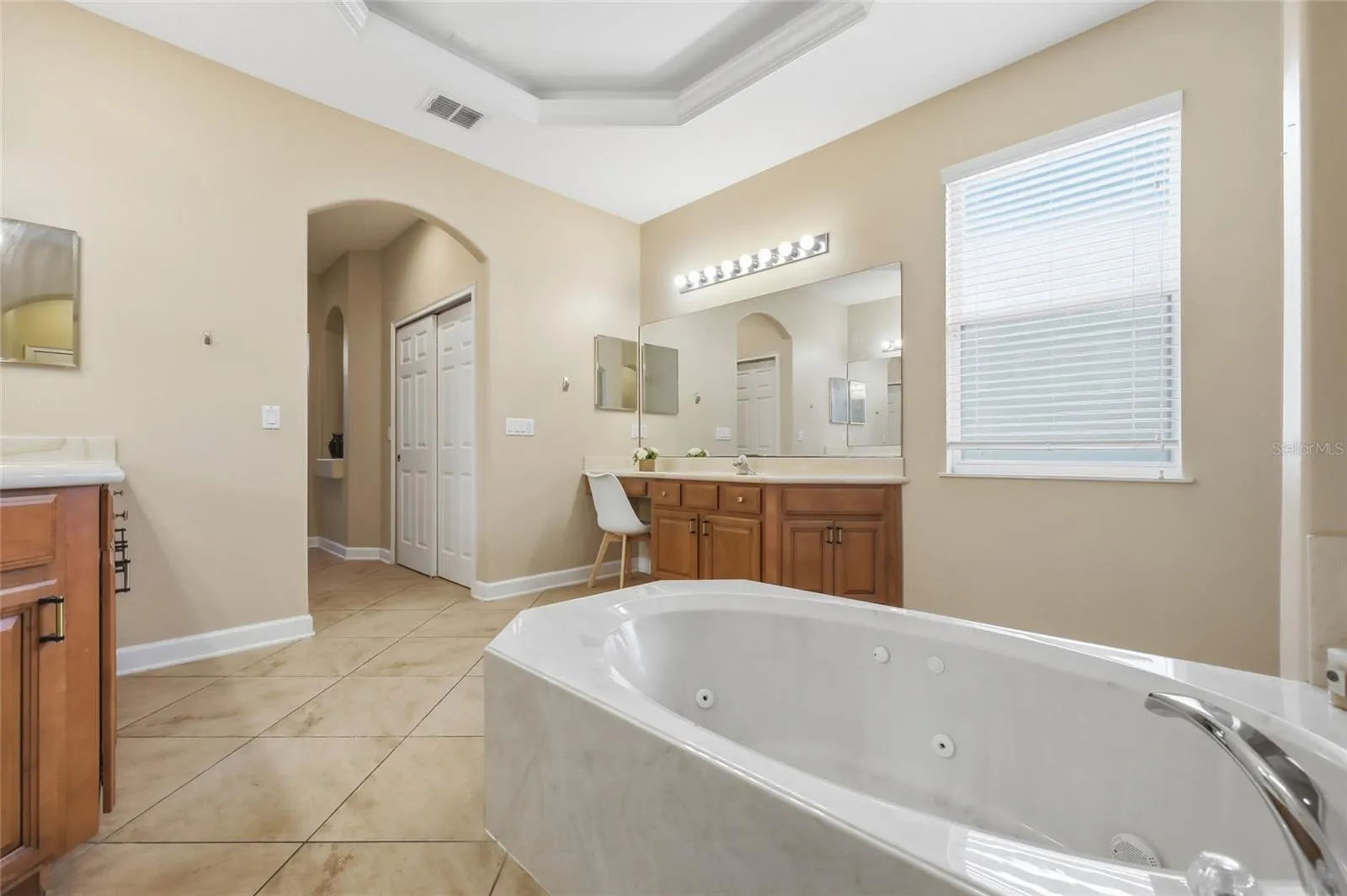 The owner’s suite is a true retreat, featuring direct pool access, tray ceilings with crown molding, dual walk-in closets, and a spa-like bath with jetted tub, tiled shower with dual heads, and two vanities.