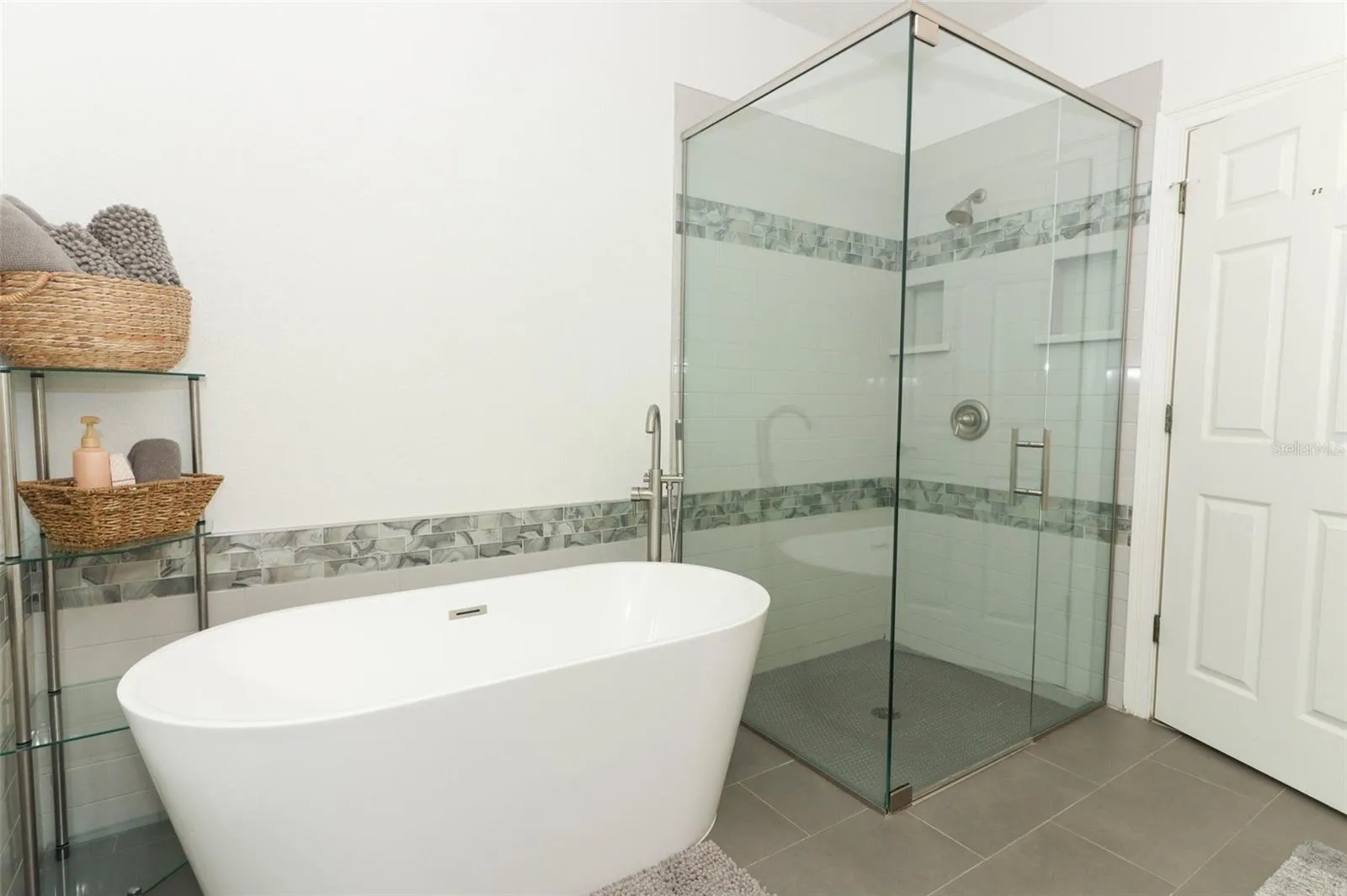 A spa-inspired ensuite bathroom with a freestanding soaking tub, upgraded fixtures, and dual vanities