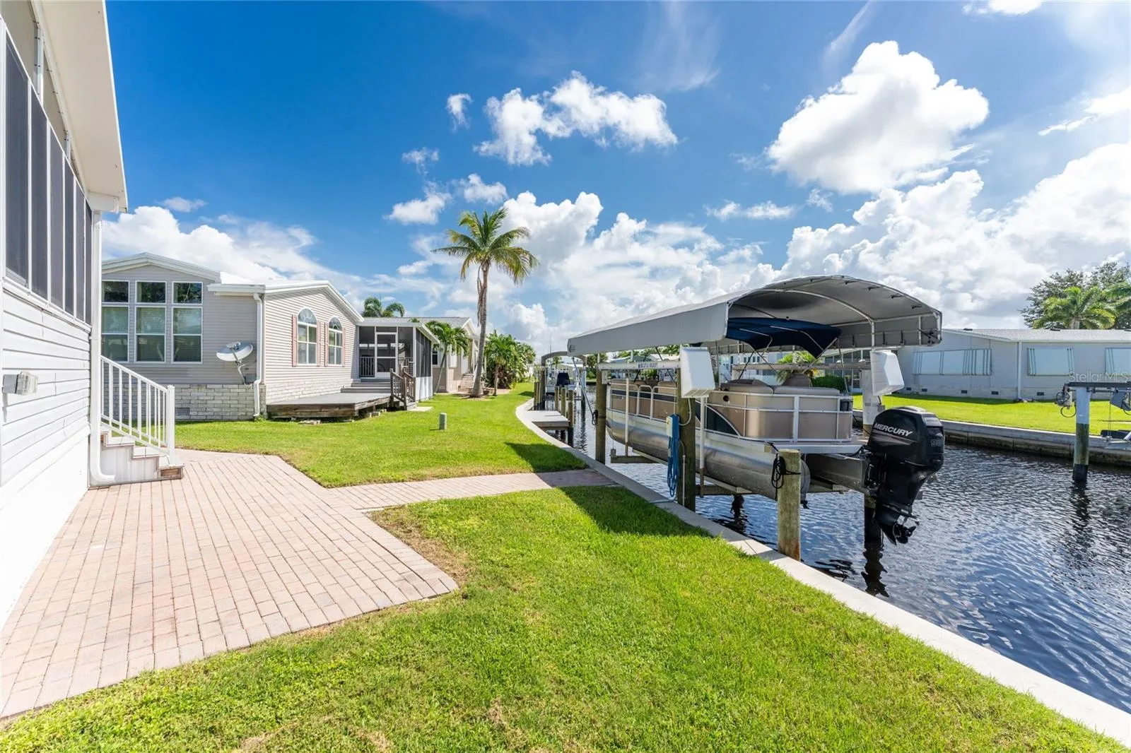 EXCELLENT WATERFRONT VALUE! GULF ACCESS HOME, just 20 minutes to the Harbor via Alligator Creek. No bridges to the Harbor. This charming home includes attractive, quality furnishings, has a newer roof and carport (2023), has an open floorplan and appealing updates. The Florida room overlooks the water and your covered boat lift that has newer pilings and electrical. A handsome brick driveway leads to the double-door shed/workshop with room to store all the tools and toys. The brick path continues to the back of the home where you’ll find a sunning patio and your waterfront amenities. Perfect location close to the pool and clubhouse. Windmill Village is a resident-owned community with a saltwater marina, boating club, kayaking club, bocce ball, horseshoes and much more. The upscale clubhouse includes a library, billiards room and grand hall for dinners, dances and events. A resort sized heated pool is perfect for laps, water aerobics or lounging with friends. Sell the lawn mower, grab the fishing gear and head down to your tropical retreat! A monthly fee of $260 covers lawn mowing, water & sewer, recreation facilities and management. A $20k share buy-in is required at purchase and is returned when you sell. Windmill Village offers a wonderful lifestyle just minutes to downtown Punta Gorda waterfront and restaurants. Note – artwork does not convey.