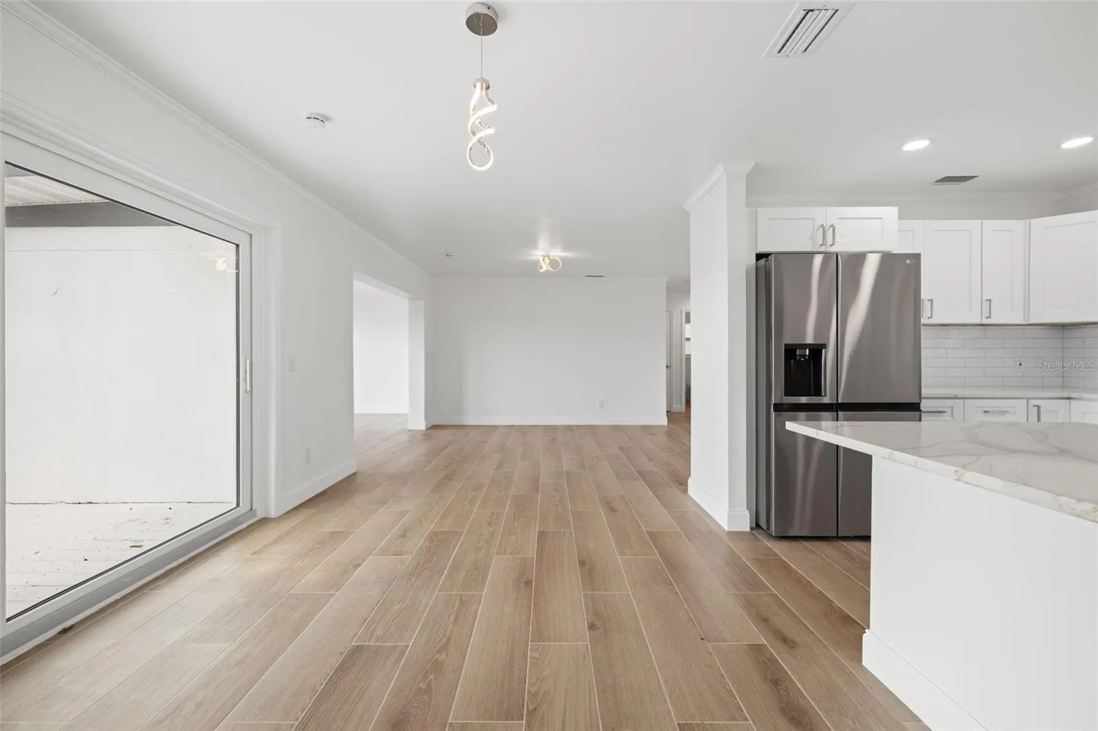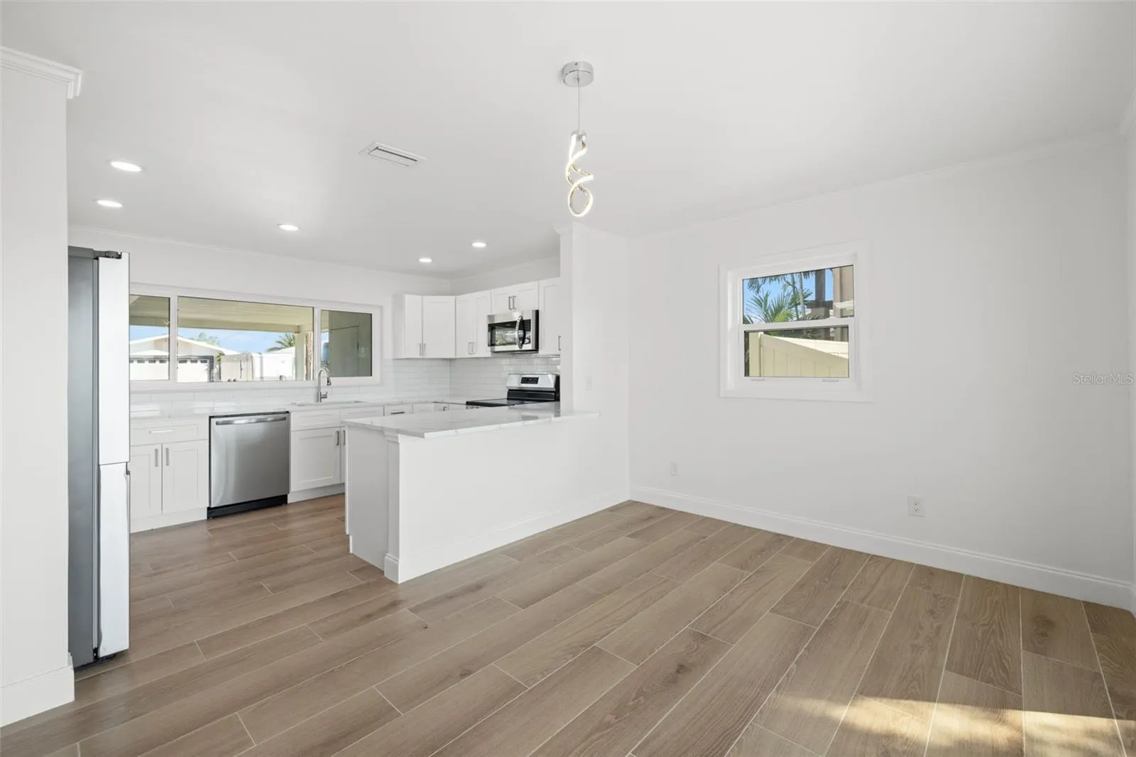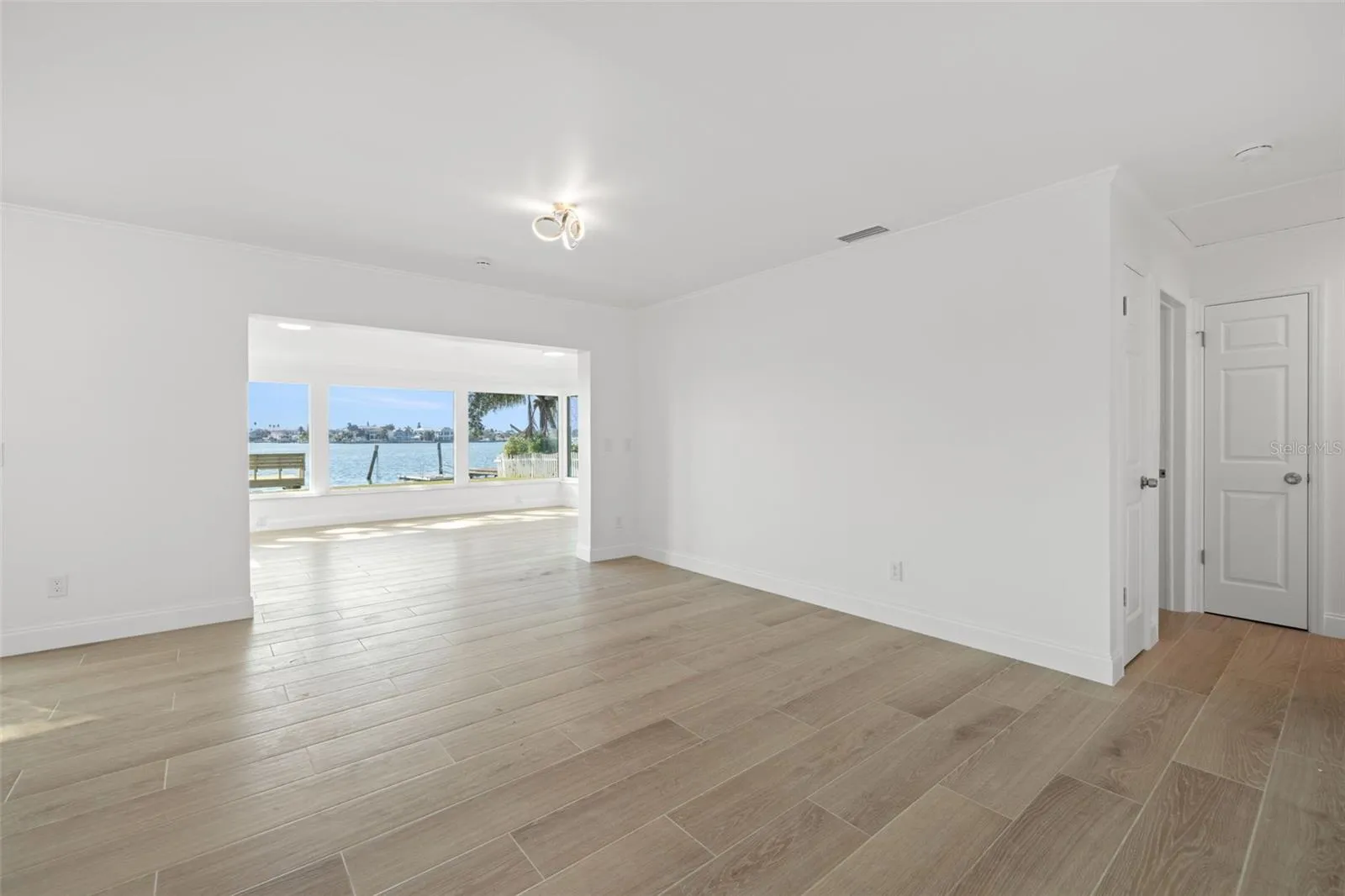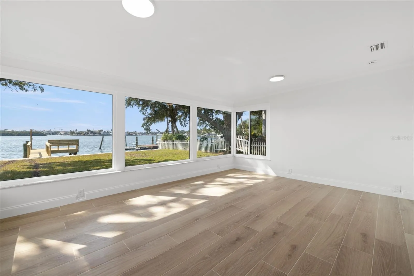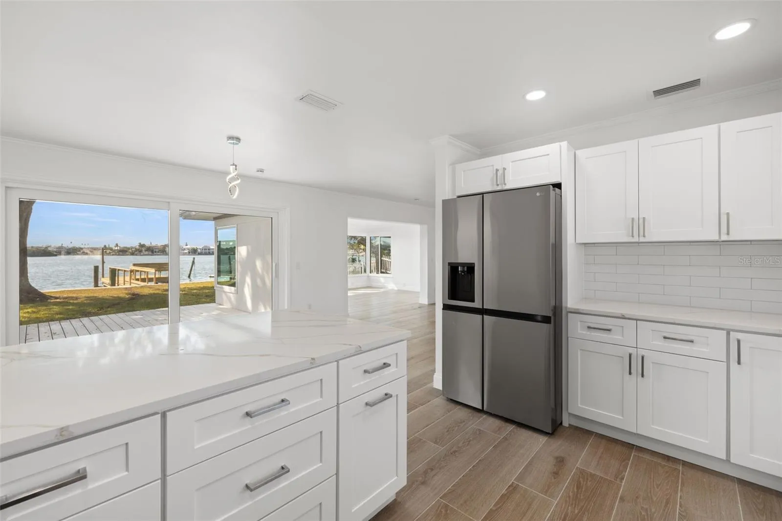 Inside, the open floor plan was reworked to frame the water view. The kitchen features quartz countertops, new cabinets, and modern appliances, flowing into connected living and dining areas finished with tile-plank flooring, crown molding, and updated fixtures. Two updated bedrooms and two remodeled tile bathrooms that feel crisp and coastal, while the large 17 x 13 flex room with expansive water views can function as an extra sleeping area, office, media room, creative space or maybe a 3rd bedroom if you need it.