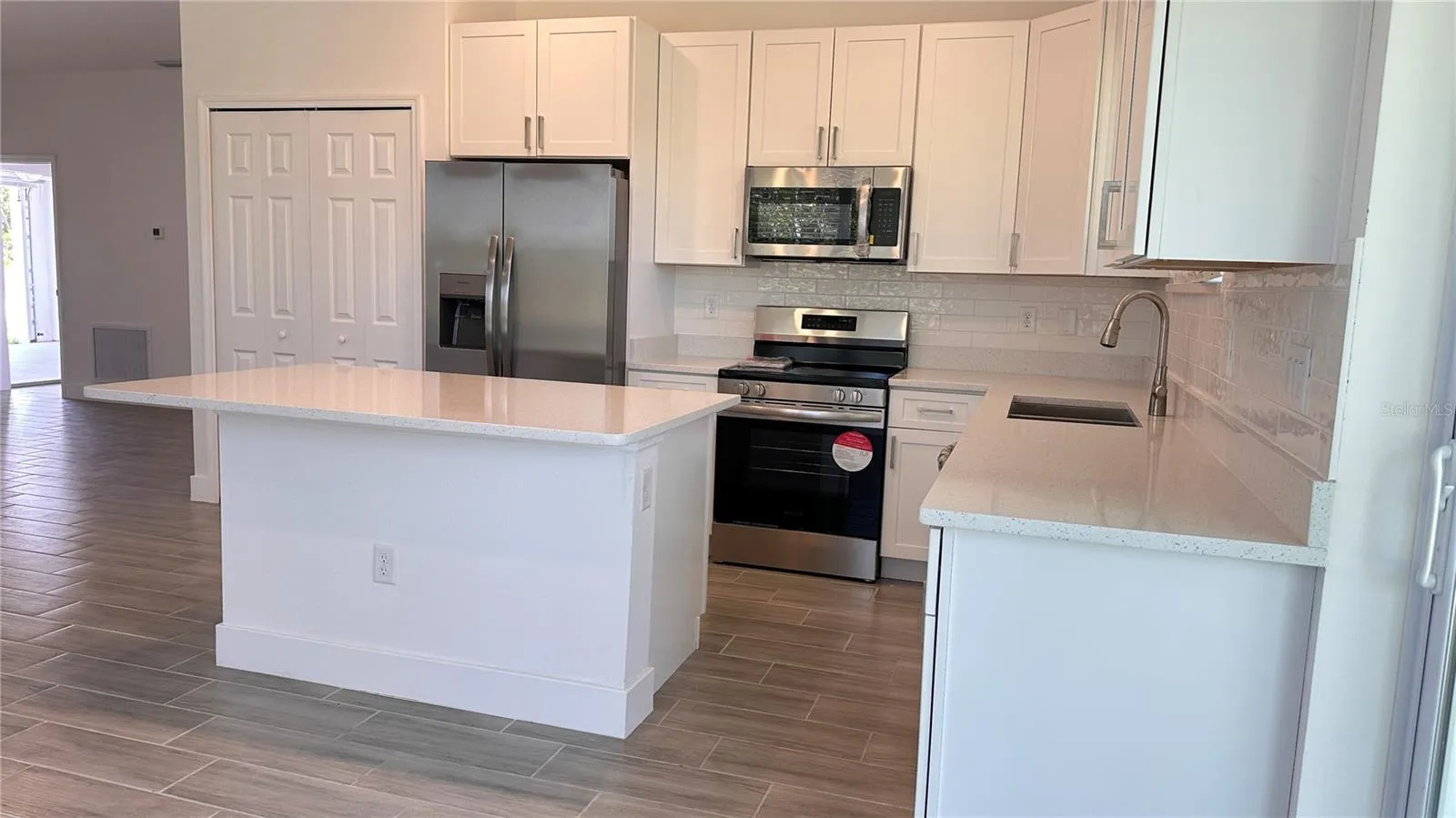 The open-concept design features ceramic tile flooring, a spacious living area with sliding glass doors that open to a paved terrace, perfect for enjoying the Gulf Coast breeze. The kitchen includes stainless steel appliances, a central island, a pantry, and a convection oven/microwave, making it ideal for cooking and gathering.