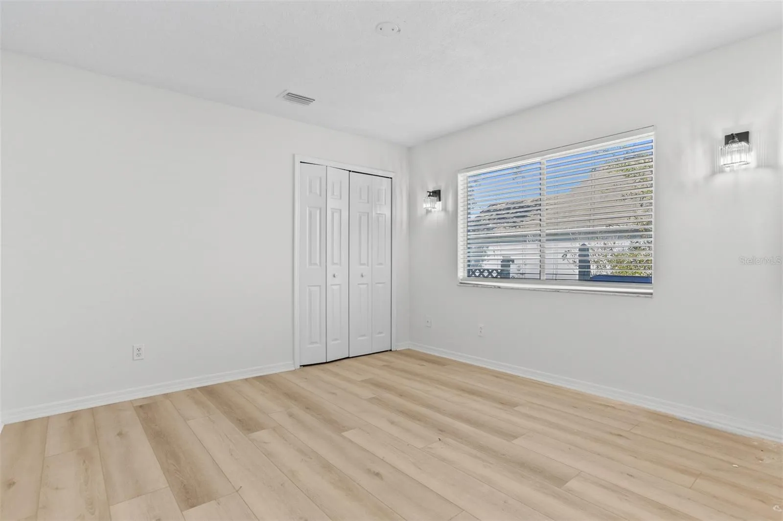 The primary suite feels like a luxury retreat with a stunning spa style bathroom that showcases a freestanding soaking tub, double vanities with quartz counters, upgraded black and gold hardware, and a walk in glass shower. Every detail has been thoughtfully designed to create a clean and elegant space. In addition to the 3 bedrooms, the spare bedroom has its own office nook and direct access to the pool area, perfect for guests or a work from home setup.