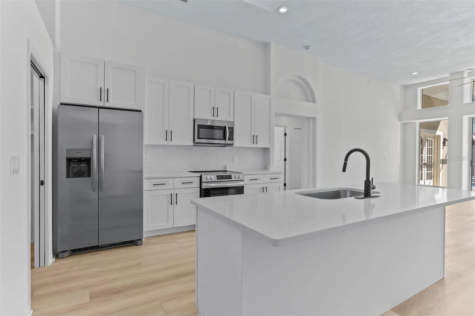 The kitchen offers a spacious layout with crisp white cabinetry, stainless steel appliances, a walk in pantry, and a large quartz island. The open concept flow creates a layout perfect for entertaining, connecting the kitchen seamlessly to the main living areas for effortless gatherings and everyday comfort.