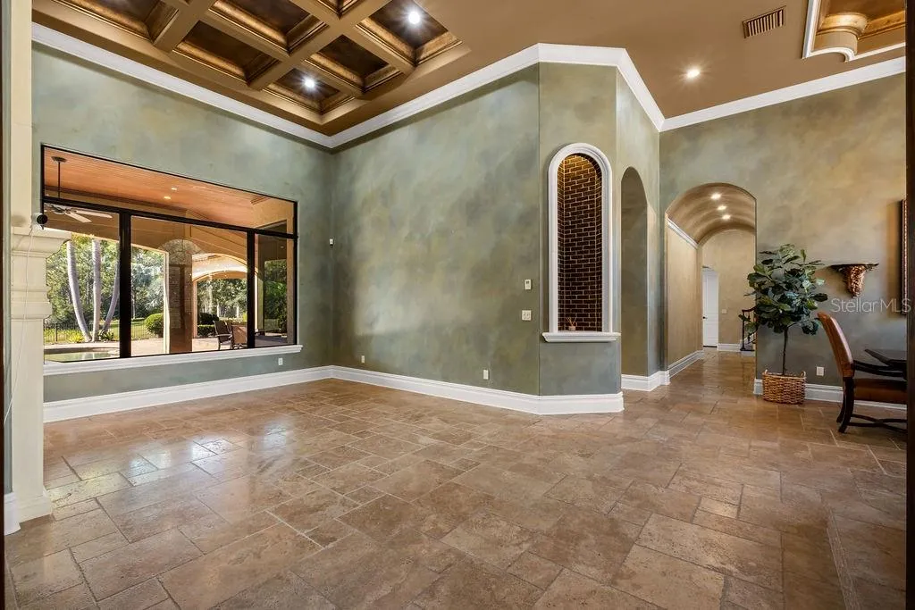 Luxury finishes include travertine flooring, soaring ceilings, extensive trim detail, picture-frame windows, custom lighting, and seamless indoor-outdoor living through 10-ft sliders connecting the family room, game room, and lanai spaces. The open dining room features a signature chandelier and architectural ceiling detail.