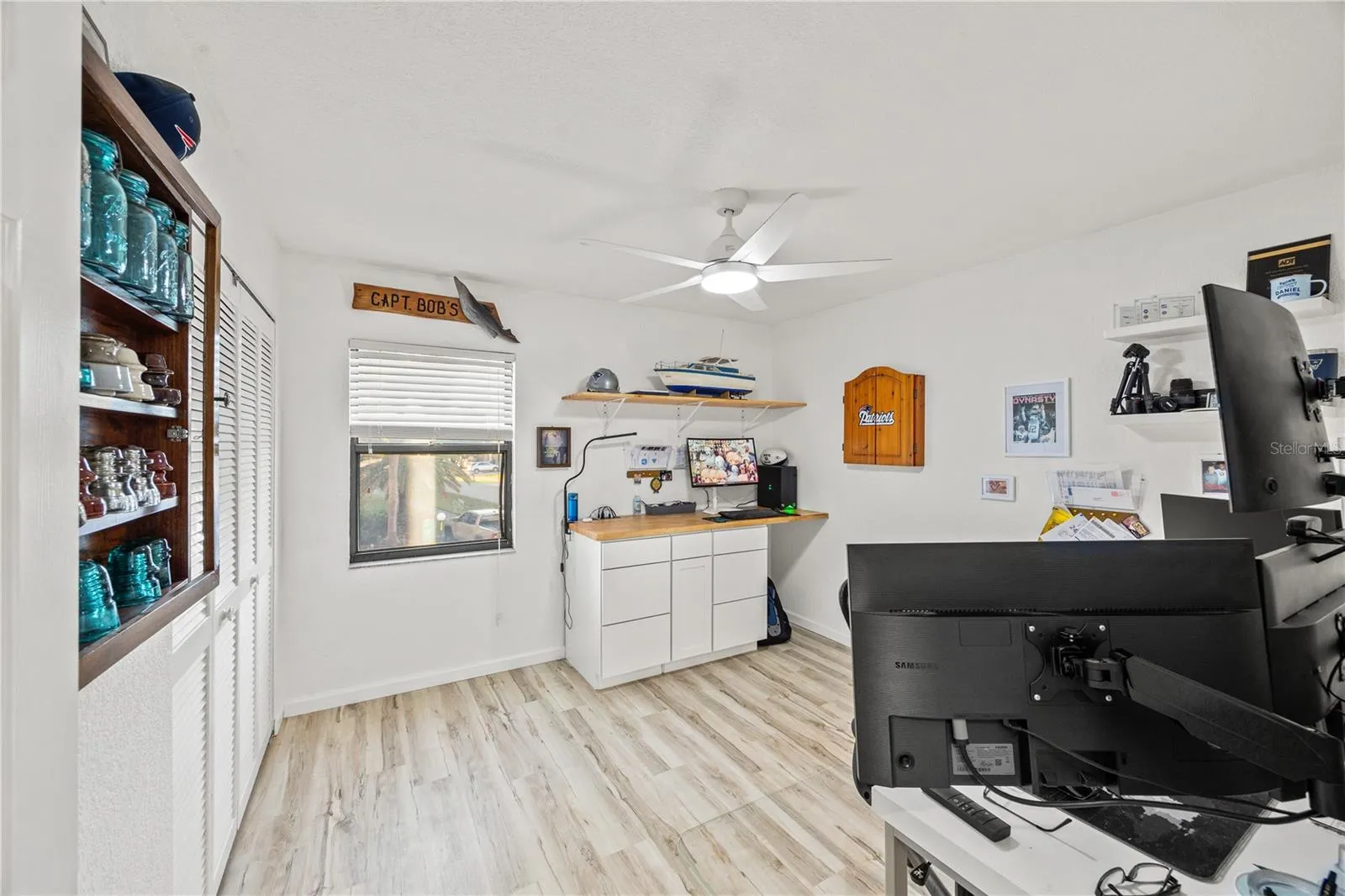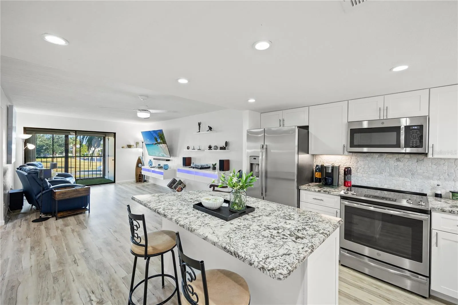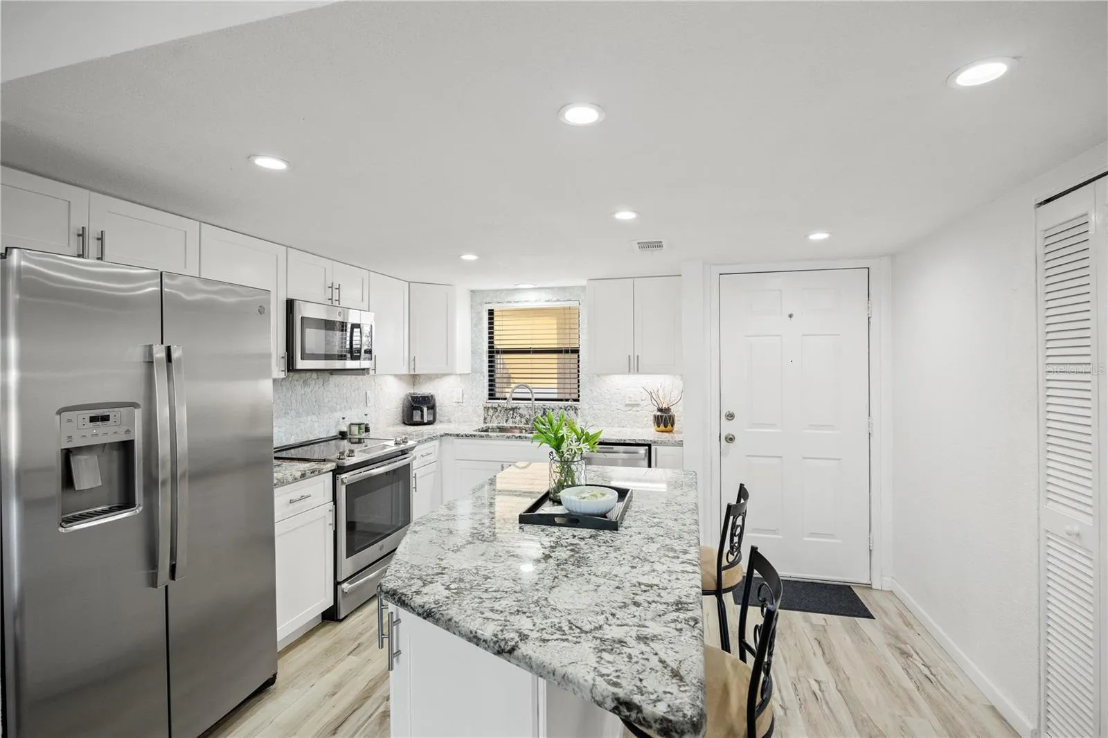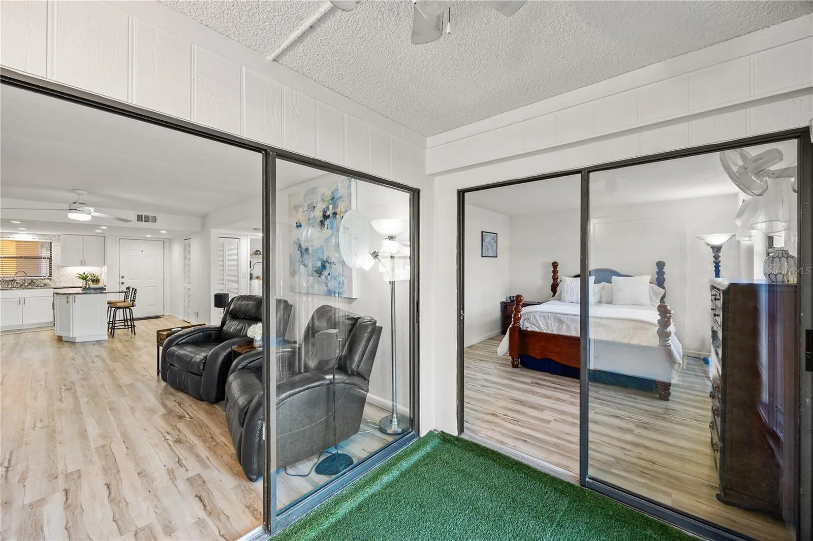 The residence boasts brand new hi-end laminate flooring through-out, a brand-new gourmet kitchen, featuring premium quartz counter-tops, a full suite of stainless steel appliances, and abundant cabinet space. Throughout the unit, you will find a fresh interior paint palette complemented by stylish, newly installed fans and light fixtures, enhancing the modern aesthetic. The open-concept layout maximizes the outdoor view, ensuring the owner can enjoy it even while in the kitchen. The spacious primary bedroom suite offers a true sanctuary, complete with direct access to a private, screened lanai. The bedroom includes generous storage solutions, supplemented by an additional dedicated storage closet on the lanai.