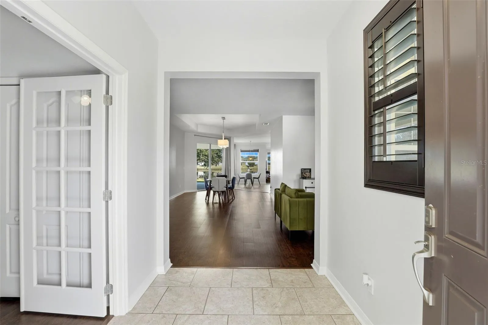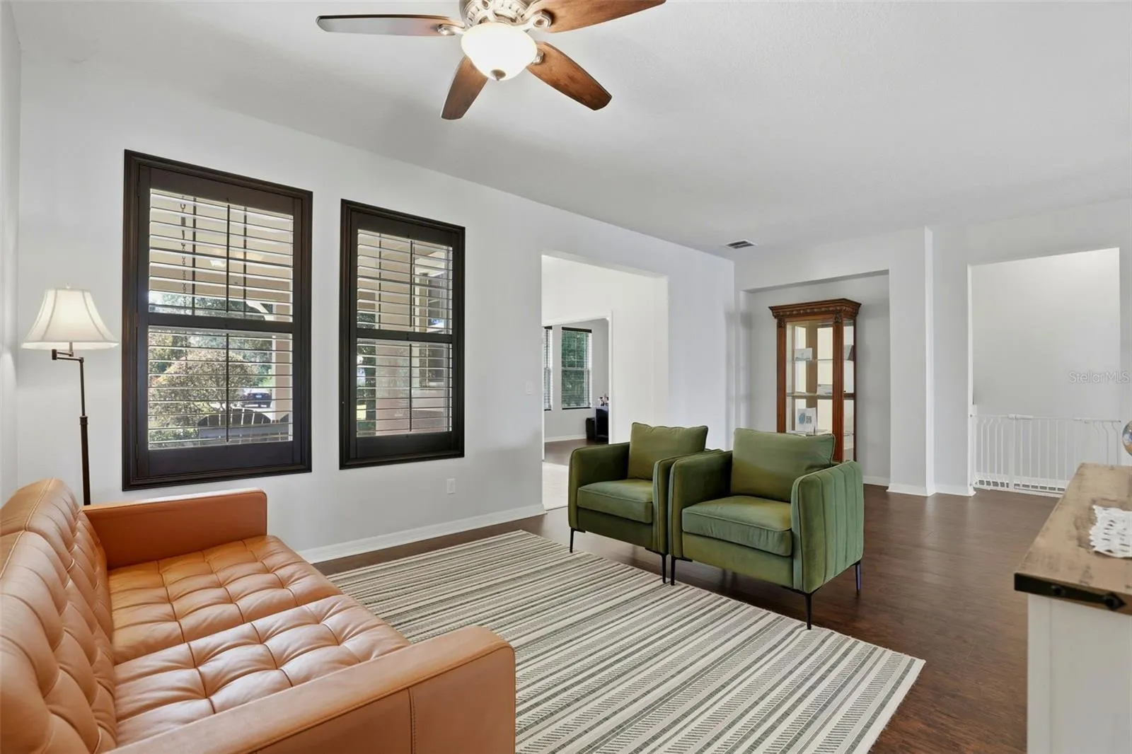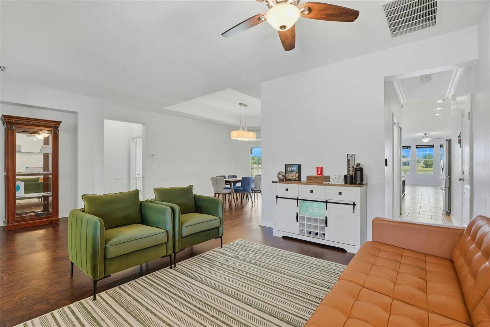 This spacious one-story home features an inviting front rocking-chair porch, a rare three-car garage with custom interlocking shock-absorbing flooring, and a triple-split bedroom floor plan offering privacy, flexibility, and exceptional flow. The interior showcases beautiful dark laminate flooring, high ceilings, and a bright open-concept design. The front flex room off the foyer is ideal as a home office, nursery, fitness room, or private sitting area connected to the primary suite.