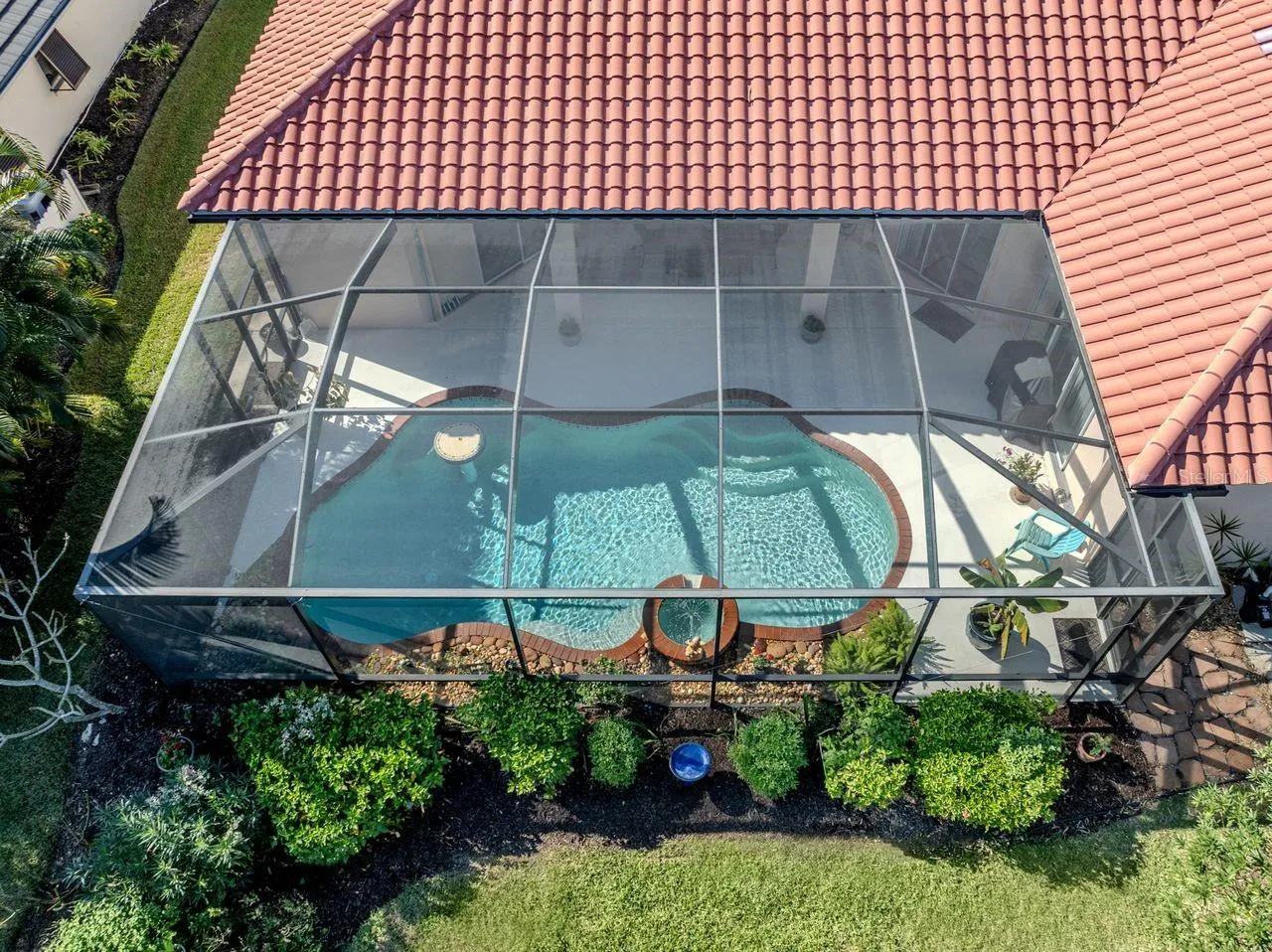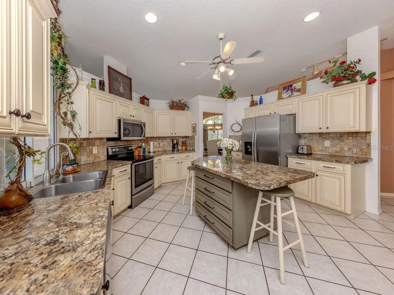 Stunning custom J&J built 3 bedroom, 2 bath, 2 car garage 2400+ SF home on large lot. Experience quality & comfort in this spacious home 2400+ SF of living space with 10 FT ceilings throughout. Extra large beautifully renovated kitchen featuring custom cabinetry, a large Island, designer backsplash, and a generous pantry- perfect for entertaining or family gatherings. Separate living room, dining room plus expansive family room has an inviting open plan. Large, relaxing primary suite has Roman shower, and his & her walk-in closets. Enjoy peace of mind, with NEW HVAC SYSTEM with extra insulation for energy efficiency- 2025. All vents & ductwork cleaned & sanitized for allergens – 2025. NEW TILE ROOF -2023, POOL CAGE -2023, gorgeous custom double entrance doors -2023 and exterior house freshly painted -2025. House also wired for generator. Step outside to your private oasis with 14×28 HEATED pool with fountain & BUILT-IN TABLE with jets, surrounded by lush landscaping for privacy & relaxation. A warm inviting move-in ready home! Desirable community with Clubhouse, community junior olympic pool, tennis & pickleball courts, sparkling lakes & walking/biking trails. Low HOA fee& no CDD fee. Great location to historic downtown Venice, Gulf of Mexico beaches, Golf courses, fine dining, shopping, the Atlanta Braves baseball stadium & I-75.