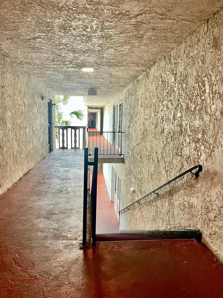 A laundry closet with a stacked washer and dryer is conveniently placed next to the kitchen dining area. The building provides an elevator and a trash chute for added comfort.