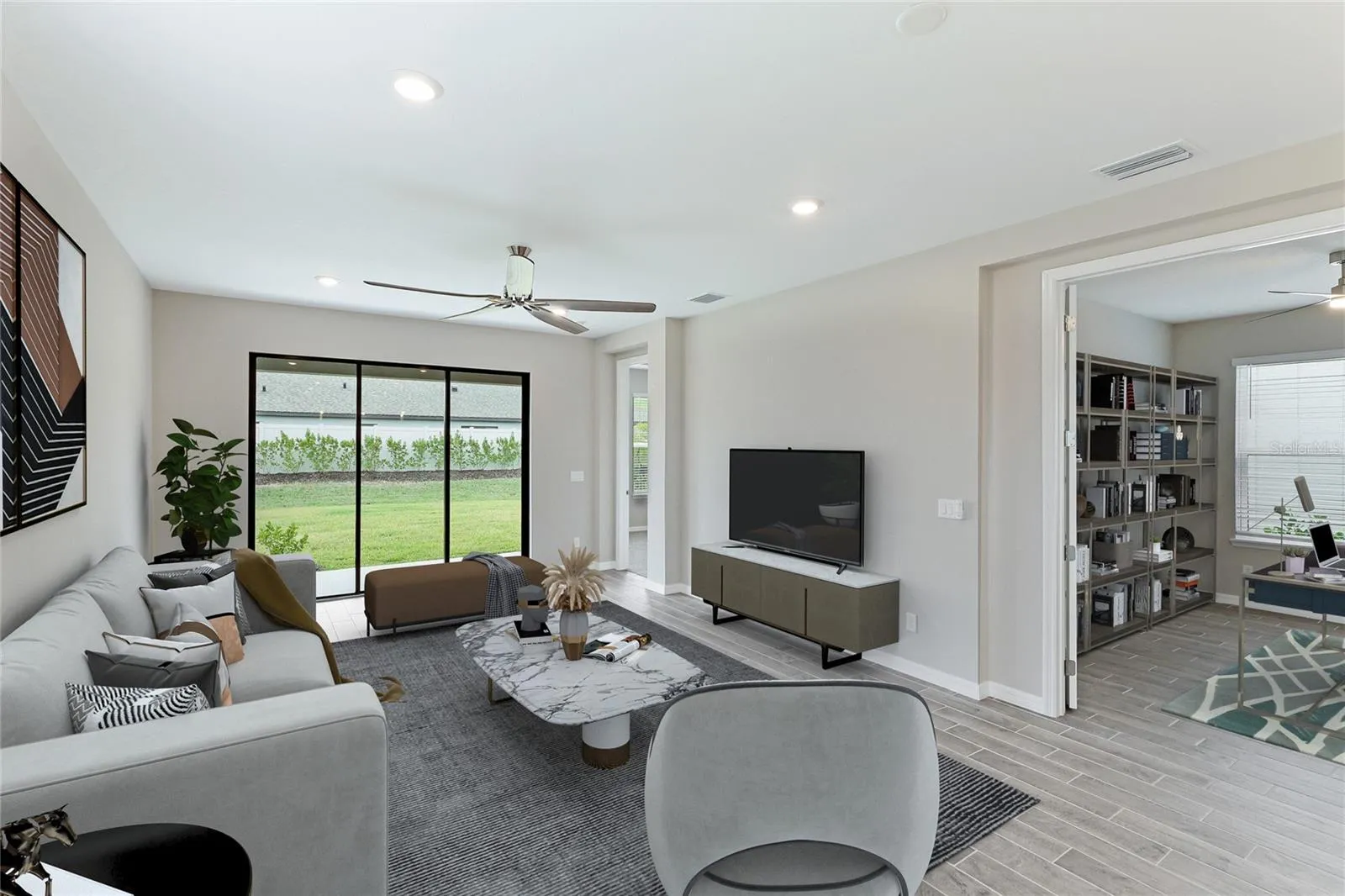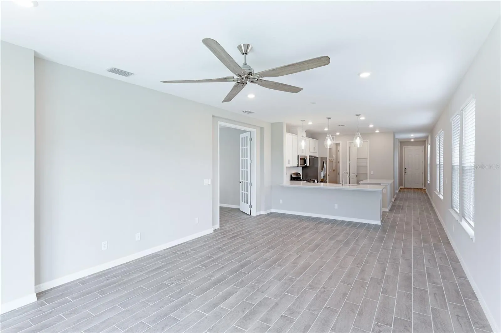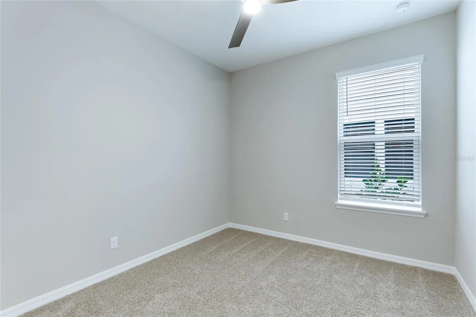 The primary suite includes an impressive 9-foot walk-in closet and a beautifully designed bathroom with a Roman-style walk-in shower. The main living area features durable ceramic tile flooring, while all bedrooms are comfortably carpeted. The home also includes several upgraded ceiling fans and thoughtful design details throughout.