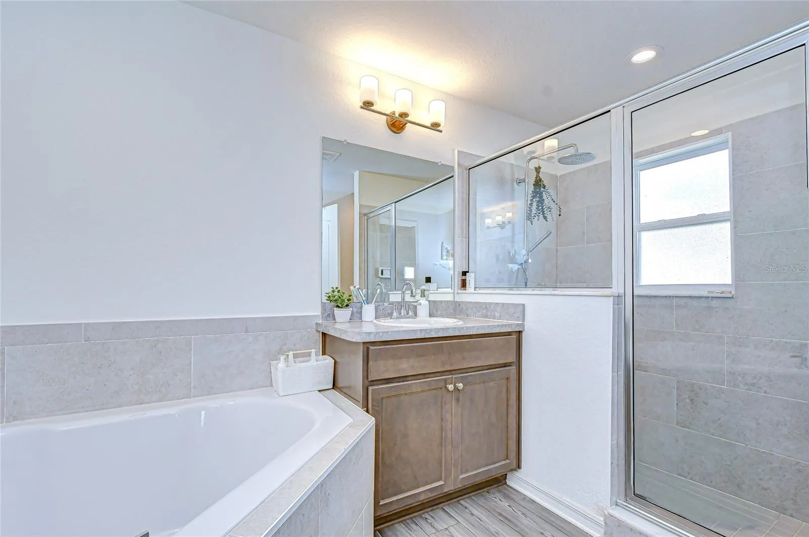 bathroom provides for 2 separate vanities, a large tub for relaxing, and sizable, tiled, shower