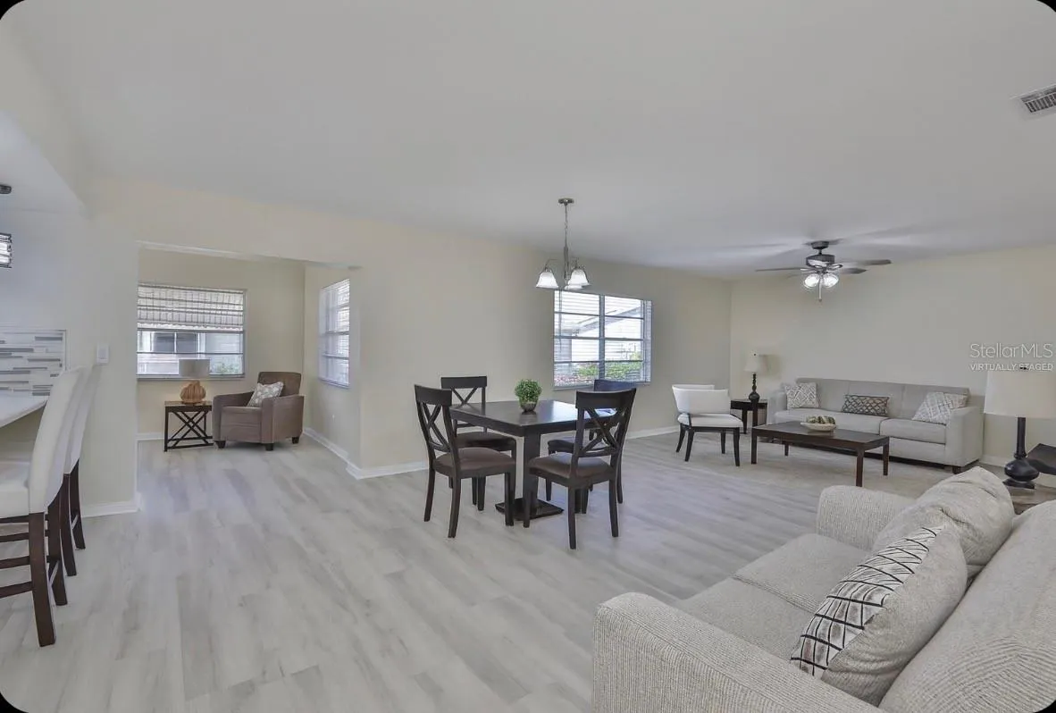 Step inside to find newly refinished ceilings with a smooth knockdown texture and luxury vinyl plank flooring throughout. The redesigned kitchen features soft-close cabinetry with stylish matte hardware, quartz countertops, GE stainless steel appliances, a deep 9” stainless sink, a Moen pull-out faucet, new garbage disposal, three decorative pendant lights, new recessed lighting, and an open, inviting layout that flows into the main living spaces.