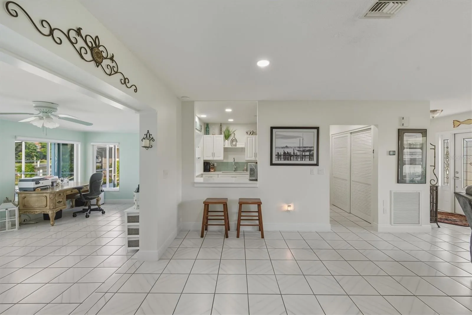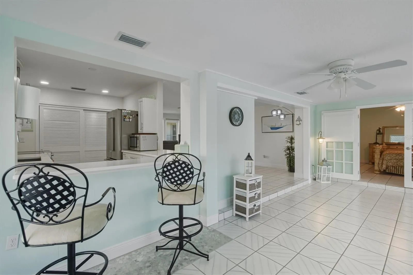 Inside, the bright open floor plan flows effortlessly from the spacious living and dining areas to a custom 2021 kitchen featuring quartz countertops, soft-close cabinetry, stainless-steel appliances, touch-free faucet, large pantry, and a convenient pass-through to the dining room. The all-seasons Florida Room adds nearly 250 sq ft of under-air living space, wrapped in impact windows, remote-control electric shades, and waterfront views that reset your blood pressure instantly.