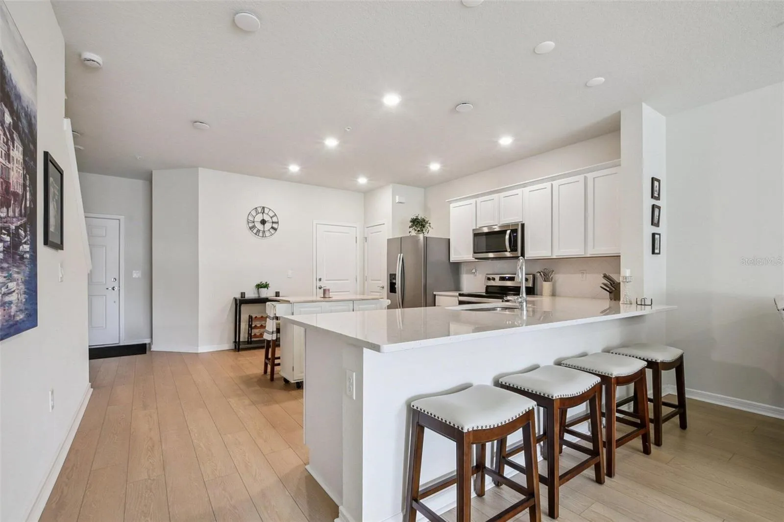 Gorgeous 2-Story Townhome, newly built in 2024. Located in upscale Winter Park, Florida, close to fine dining, shopping and entertainment. Minutes from downtown Orlando and Orlando theme parks, this manicured gated community showcases beautiful landscaping and a sparkling pool surrounded by coveted modern architecture. The home contains the high-end Lux Fresh interior package, and owner has added light dimmers, ceiling fans, window coverings and a kitchen island. In addition to seating capacity at the expansive, stone kitchen counter, new stainless-steel appliances complete this large chef’s kitchen. The stunning open-concept living area is great for entertaining or just relaxing and admiring the flawless finishes. The master suite is spacious with a walk-in closet and double-sink ensuite. Bedrooms 2 and 3 are roomy and share a full bath with bathtub/shower combo. Snow color cabinetry and tile plus smooth stone counters add a touch of elegance throughout. Wood plank floors on the first floor, with soft tone carpet on the 2nd floor and artisan tile floors in the bathrooms and laundry cabinet. Private outdoor lanai enhanced by lush greenery in the back. Attached garage with additional off-street parking spaces in the front. HOA fees are competitive and cover roof replacement, Spectrum internet & TV as well as upkeep of the property.don’t miss this opportunity!