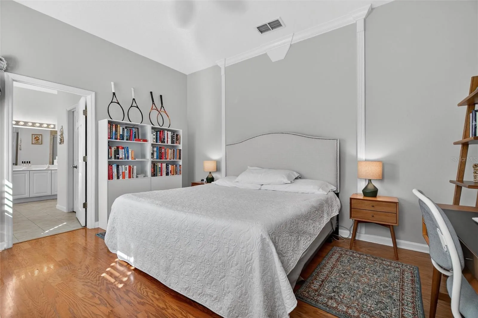 A coveted First Floor Owners’ Ensuite Bedroom! The Foyer opens to the Large Open Living/Dining Room combination for large gatherings. Energy Saving Features: a 2025 Zoned Luxury A/C System, 2022 Roof, New Range, New Washer and Dryer. Additional Special Features: 2025 New plush Carpet on stairway and entire 2nd level, Oak Hardwood floors, Crown molding, Wainscoting, Plantation Shutters, Custom Fans and Lighting throughout! The back Porch is Screened for comfort and has a great view of the Private Courtyard with Patio and space for Dining and Grilling. The Courtyard has beautiful flower hedges and mature tropical trees. The KITCHEN features Granite counters, 42″ cabinets (some with pull out shelving, a Pantry, Table height Seating for 4 at the Center Island and Stainless appliances. The Owners’ First Floor Ensuite has a Walk-in Closet, Wood Floors and Plantation Shutters that afford a view of the Courtyard. The Bathroom has a walk-in Shower, Dual sinks, a Jetted Tub and a private water closet with a window. The Second Level Features Two Large Bedrooms with large closets, a Full Bath, and a Home Office dedicated space with built-in Desk and drawers. The Detached TWO CAR Garage has overhead Storage Racks. With an Acceptable Contract, this Townhome may be purchased with most of the furnishings. The Location is Perfect: a short walk to the Artisan Park Clubhouse, reserved for Artisan Park Residents featuring: A Resort Style Pool and Spa, State-of-the-art Fitness Center, Billiard Room, Full Bar and Restaurant, Banquet Room and popular Activities galore! Be sure and view the Video/Virtual Tour of this mint condition Townhome.