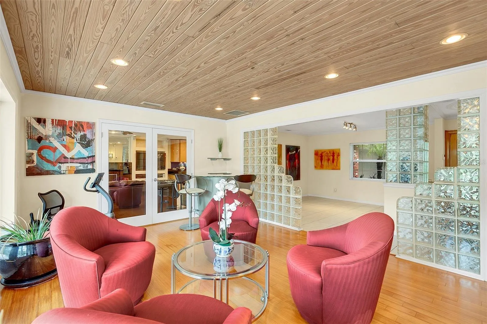 Charming traditional ranch located in the desirable “Hills” neighborhood of Winter Park! Step into a welcoming foyer that opens to a spacious floor plan accented by mid-century glass block dividers. The comfortable family room features an entertainment wall, a wood-burning fireplace, and a seamless connection to the well-designed kitchen with a peninsula island. Generous, ceiling-height maple cabinetry provides excellent storage, and the built-in oven and microwave add convenience. Just off the kitchen are the laundry room and powder bath, with direct access to the garage. The current garage has been divided to make a space for an office/flex space which can easily be removed if desired. The dining room offers a full wall of maple built-ins with display shelving and lower storage cabinetry. French doors lead to the covered lanai and pool area. Down the main hall you’ll find the hall bath with double sinks and a glass-enclosed tub, along with the primary suite and three additional bedrooms. The spacious primary bedroom features French doors to the pool, a spacious bath with walk-in shower and soaking tub, the custom walk-in closet is just off the bath. The backyard is privately fenced with a block/brick wall surrounding the open pool and expansive lanai. Recent updates include a 2022 roof, 2018 AC, re-plumbing, a tankless water heater, and a propane tank.