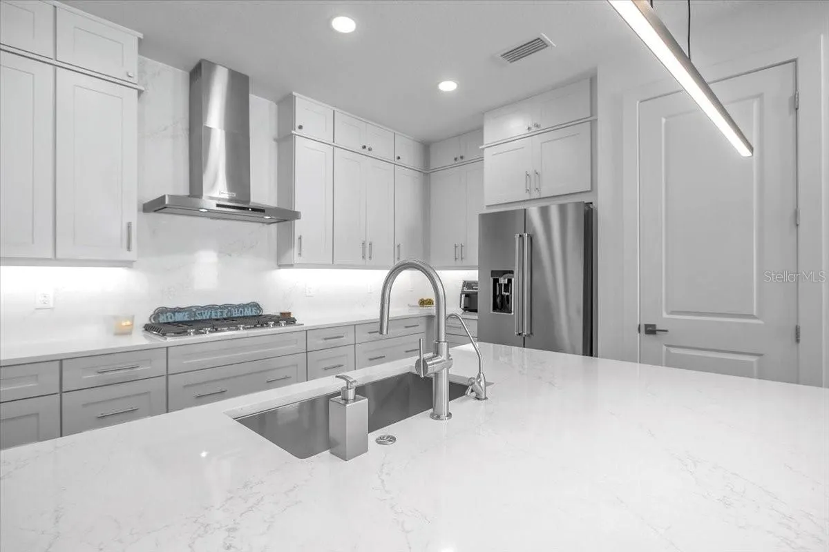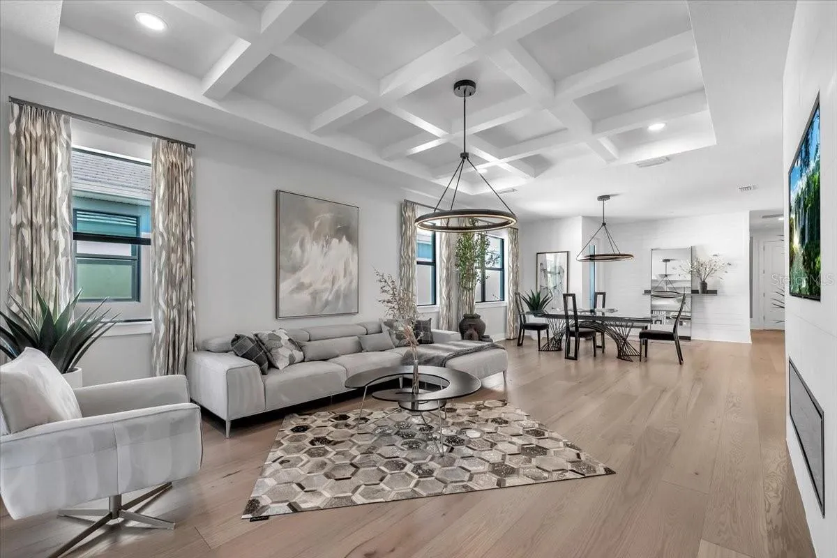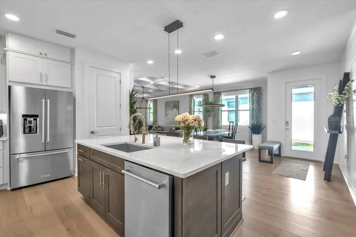 Stunning Designer Villa with exceptional upgrades in Solstice at Wellen Park. Discover luxury living in this impeccably upgraded 2-bedroom + den, 2-bath, 1,804 sq. ft. villa — one of Southwest Florida’s premier lifestyle destinations by Toll Brothers. This rarely available Dunnet floorplan has been elevated far beyond builder standards with thoughtful design choices, premium finishes, and extensive owner investments. From the moment you arrive, you’ll appreciate the glass front entry door, 8-foot interior doors, tray ceilings, and engineered hardwood floors that flow through the main living areas. Storm-impact windows, a whole-house surge protector, and an epoxy-finished garage floor provide peace of mind and long-lasting durability. Interior Highlights: * Elegant Great Room, * Elegant shiplap and tiled custom fireplace entertainment wall with electric fireplace, * Upgraded lighting throughout the home, * Beautiful wood-paneling accent wall in the Primary Bedroom, * Custom office wall, pantry organizer, and built-in storage systems for linen and primary closets, * Square-format brushed nickel hardware throughout. Exceptional Gourmet Kitchen, designed with both beauty and function in mind: * Level 5 LG Viatera Muse Quartz countertops and quartz full-height backsplash, * Extended island with additional cabinetry and upgraded drawers, * Under-cabinet LED lighting, * Chalkboard accent wall, * Premium KitchenAid stainless steel appliance package, upgraded sink & faucet. Additional custom cabinetry in the kitchen and laundry room. Luxurious Bathrooms: * Large-format tile selections, including 24×47 designer wall tile in both bathrooms, * Handheld shower in the primary bath, * Quartz countertops added to the laundry room and primary vanity, * Frameless primary shower enclosure with polished tile and niche. Outdoor Living Upgrades – No other villa in Solstice offers an outdoor space quite like this: * Extended screened lanai with upgraded metal decorative screen, * Expanded paver patio for additional seating and entertaining, * Metal fenced backyard, * Beautiful, low-maintenance landscaping. Whole-Home Quality Improvements: Storm impact windows & doors, * Whole-house saltless water filtration system + reverse osmosis at kitchen sink, * Whole-house surge protector, * Garage floor epoxy coating, * Added outlets and smart home wiring package. About Solstice at Wellen Park: Solstice is a gated Toll Brothers community offering modern architecture, a vibrant social lifestyle, and access to Wellen Park’s expansive amenities. Residents enjoy: Resort-style pool, Fitness center, Walking & biking trails. Close proximity to Downtown Wellen Park lakeside dining, shops, and outdoor activities. Minutes to Venice beaches and CoolToday Park (home of the Atlanta Braves spring training). This villa is truly an Exceptional Value. Must See!
