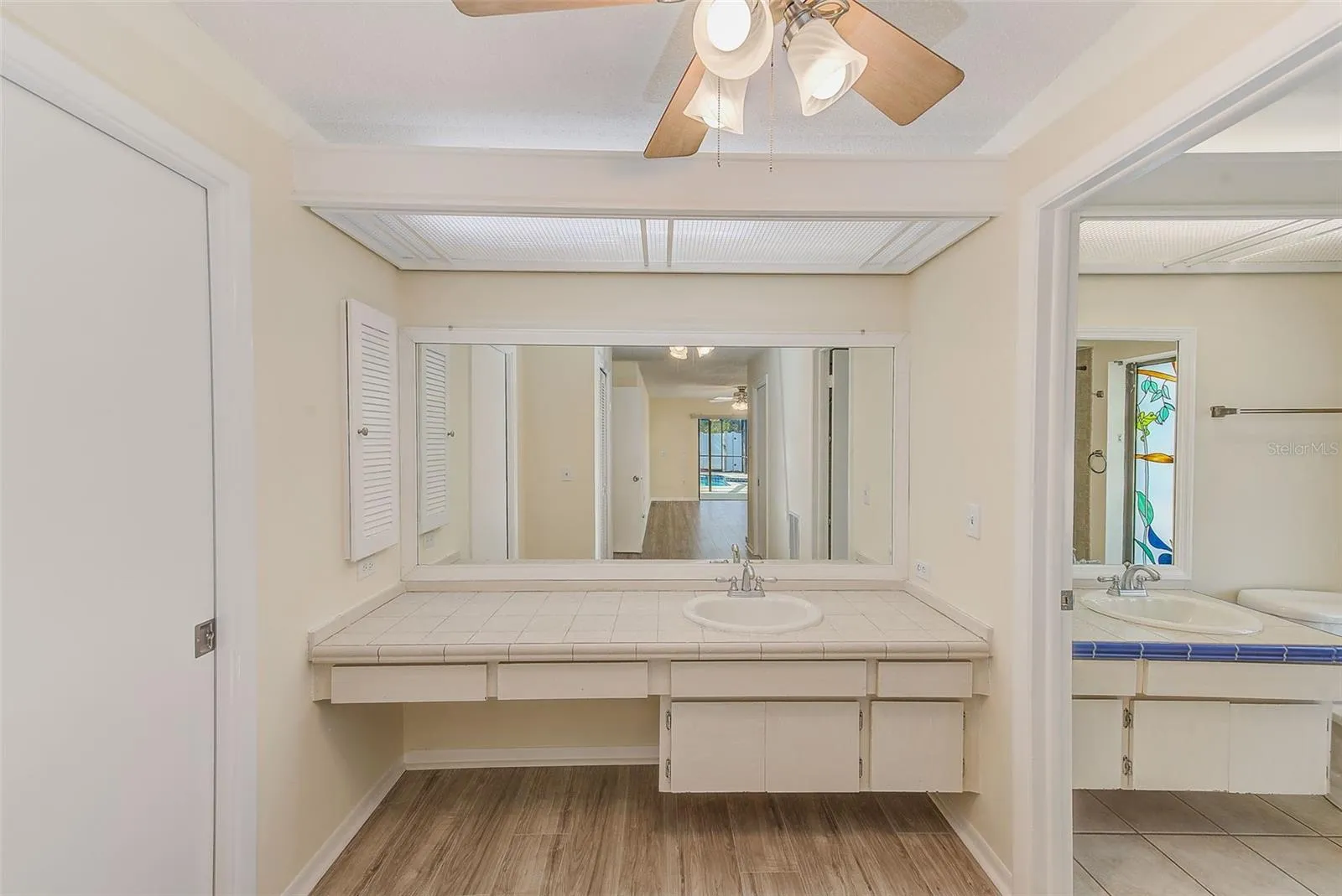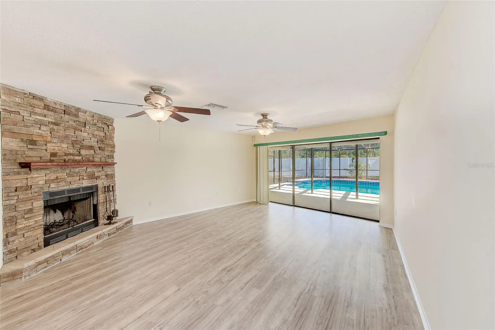 The master suite is a true retreat, offering two walk-in closets and a private en-suite bathroom with dual vanities and a walk-in shower and direct access to the pool enclosure. Two additional well-sized bedrooms provide ample space for family or guests, with a second full bathroom beautifully updated to match the home’s modern style. An open office nook just off the main living area provides the ideal space for remote work, homework, or creative projects. The inside laundry room is equipped with a new washer, dryer, and upgraded utility sink cabinet, adding everyday convenience. Wood burning fireplace in the living room for those romantic evenings.