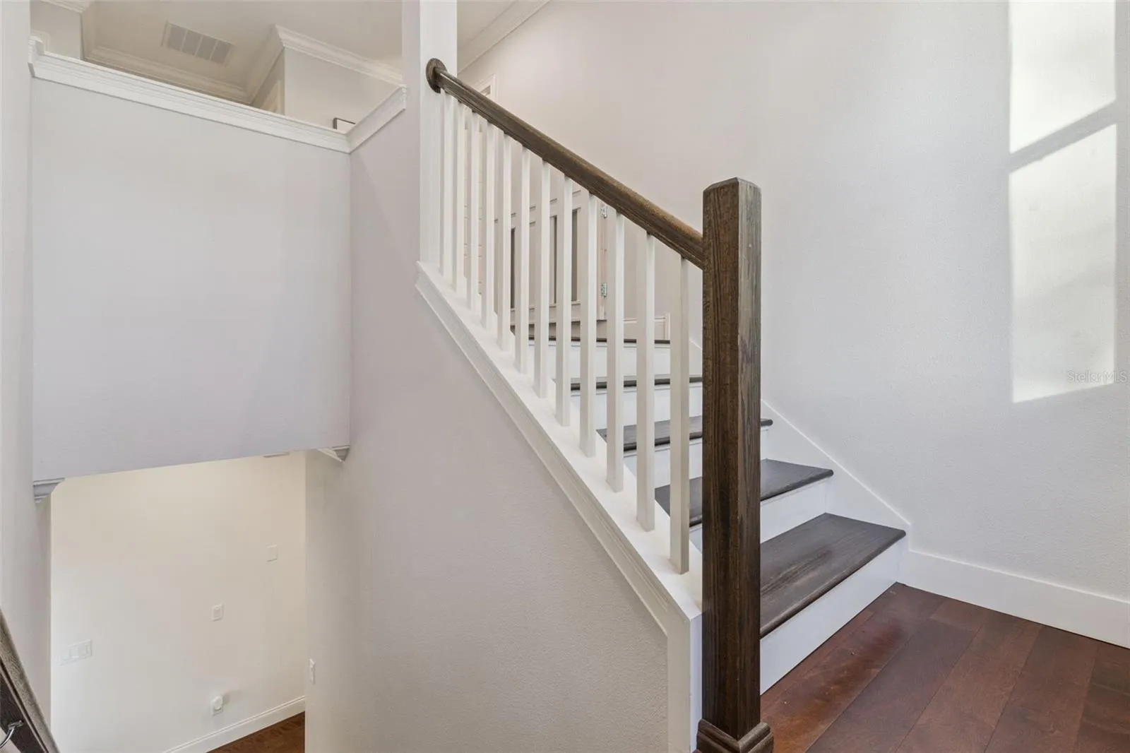 The upgraded wood staircase with white risers and wooden railings leads to a well-designed second floor, where you’ll find the primary bedroom plus two spacious bedrooms, a full bath, and an impressive laundry room equipped with cabinets, quartz countertops, and plenty of folding space. The highlight of the upper level is the massive primary suite, offering a huge walk-in closet, dual vanities, a glass-enclosed shower, and a luxurious standalone tub.