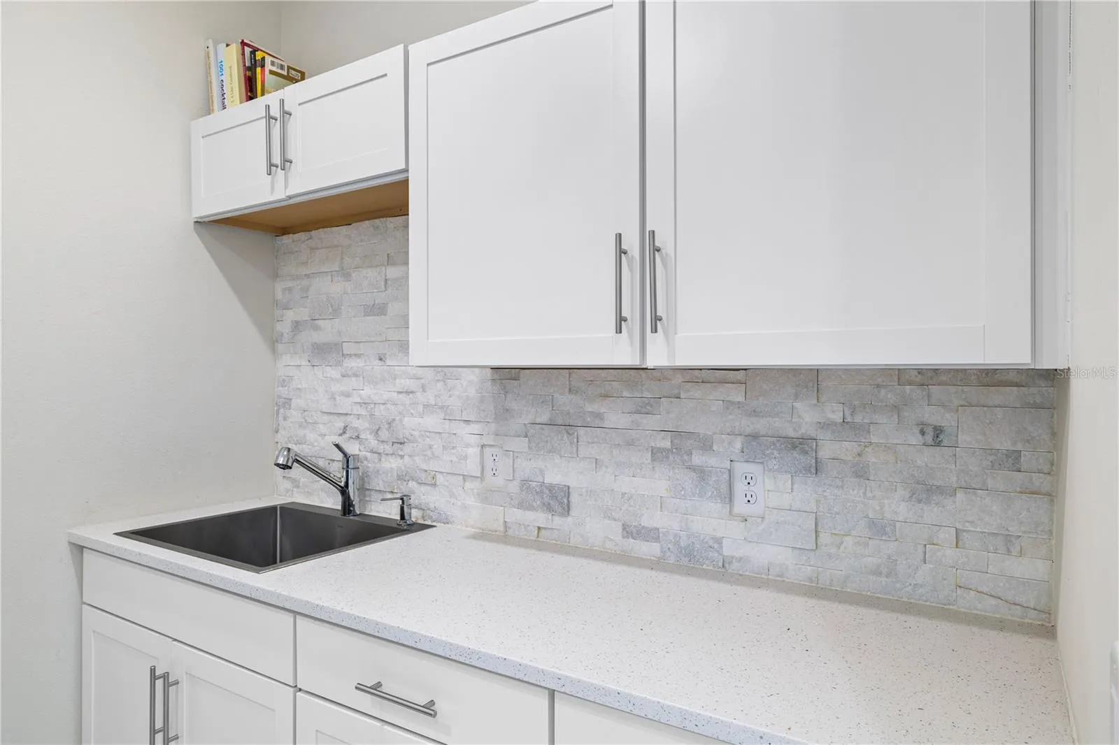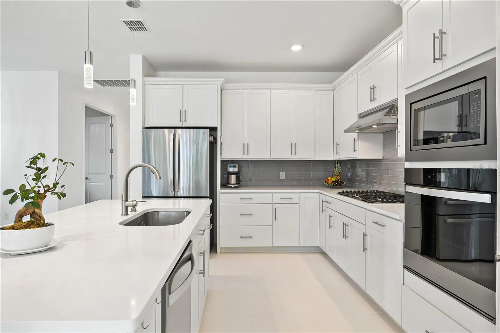 Inside, this single-story residence features 2 bedrooms, a flex room, perfect for an office, hobby space, or guest accommodations 2 bathrooms, and a 3-car tandem garage. The open-concept layout offers tall ceilings, abundant natural light, and a spacious gathering room. The gourmet kitchen is equipped with built-in Whirlpool appliances, 42” white soft-close cabinetry, Quartz countertops, decorative tile backsplas. The kitchen boasts exquisite, luxurious finishes that elevate the confort and elegance of this wonderful home.