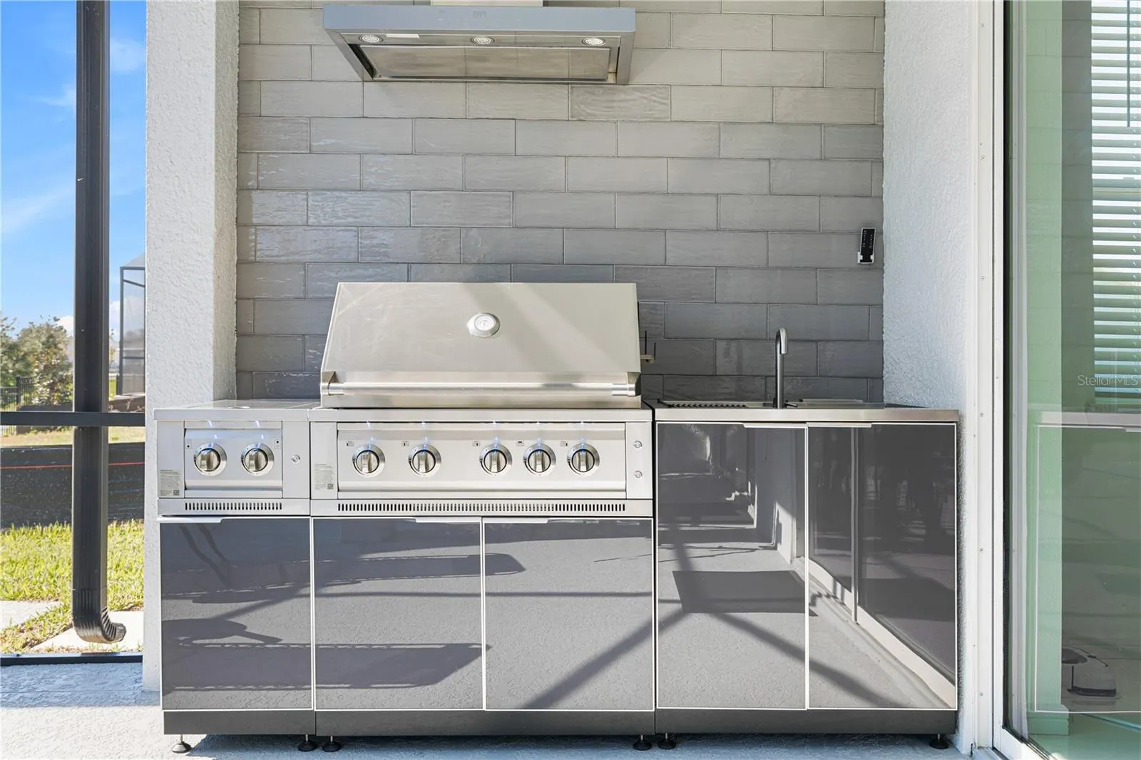 At the heart of the property is a remarkable outdoor retreat. Enjoy a custom heated saltwater pool, spa with App-controlled pool features for temperature and lighting and an extended covered lanai featuring a fully equipped outdoor kitchen in this Peaceful conservation backdrop with no rear neighbors. Designed for year-round enjoyment, this space is perfect for entertaining, relaxing, and embracing Florida living at its finest. Sliding glass doors seamlessly connects the indoor living areas to the lanai, enhancing the home’s expansive and open feel. The exterior also includes gutters for added protection and maintenance ease.