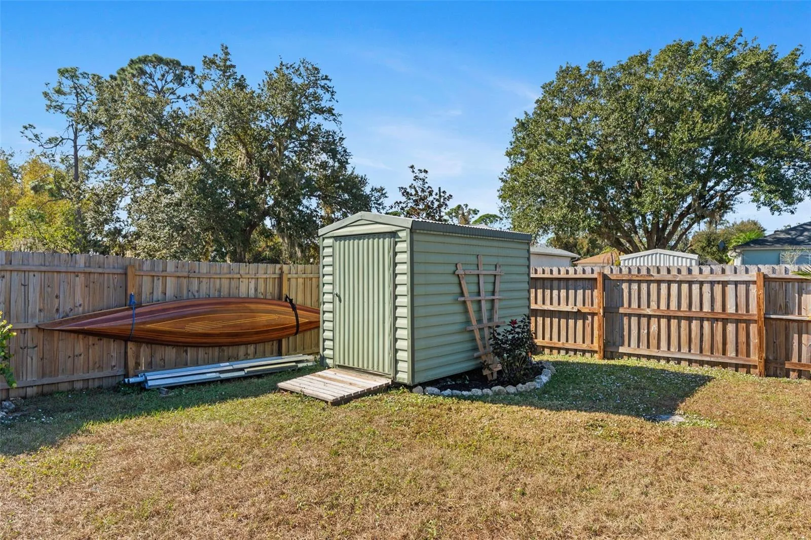 Outside, the privately fenced backyard offers a peaceful setting with plenty of room to enjoy outdoor activities.