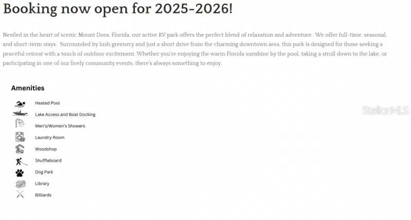 Fractional Ownership. Gorgeous, well-maintained 1 BED, 1 BATH with OVERSIZED CARPORT, 1993 DESTINY PARK MODEL in Mount Dora, minutes from downtown! 55+ COMMUNITY. Experience tranquility AND proximity to Orlando, Sanford, Tampa, Ocala, and Deland! PLUS, LOADS OF UPGRADES!