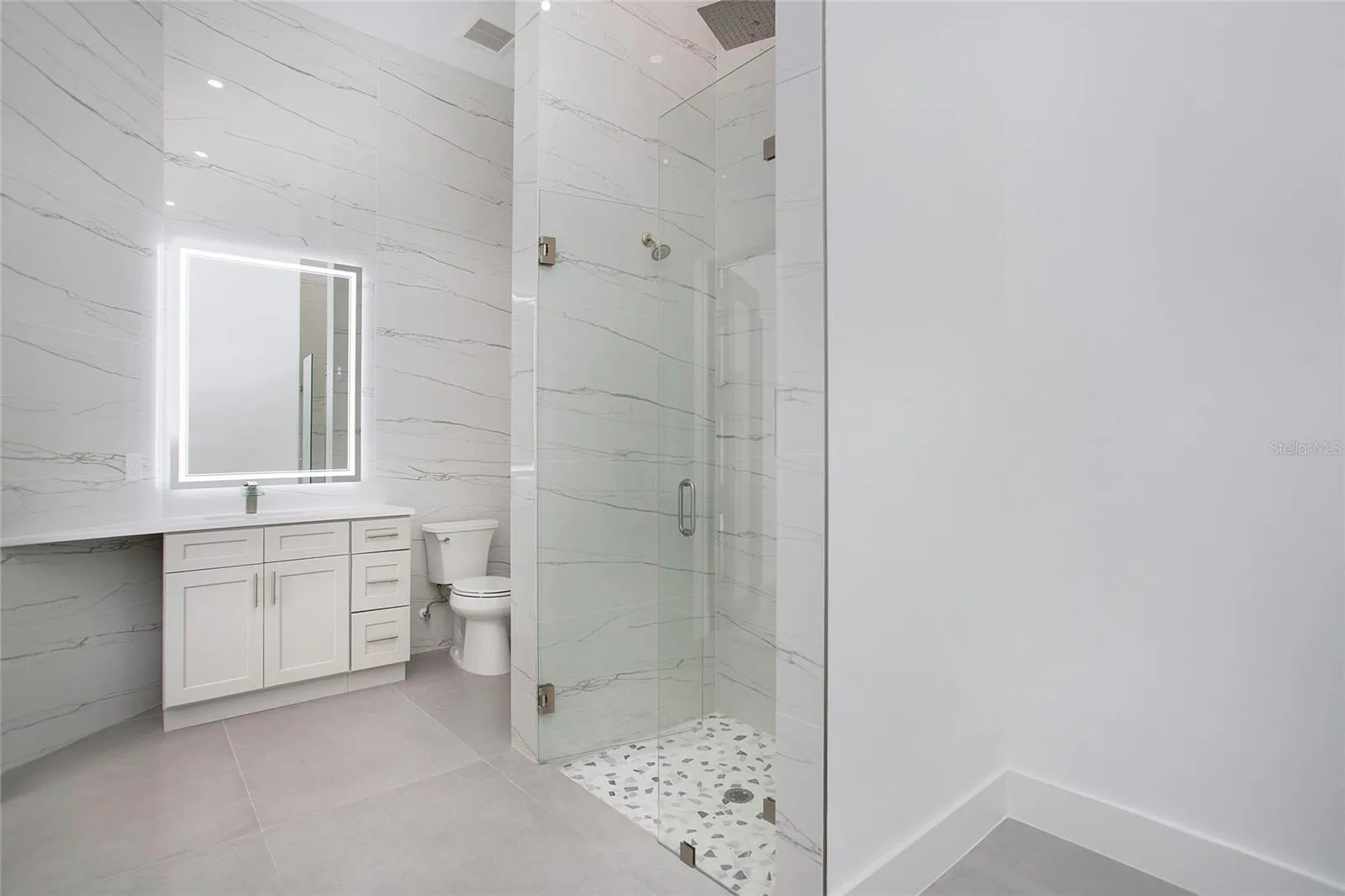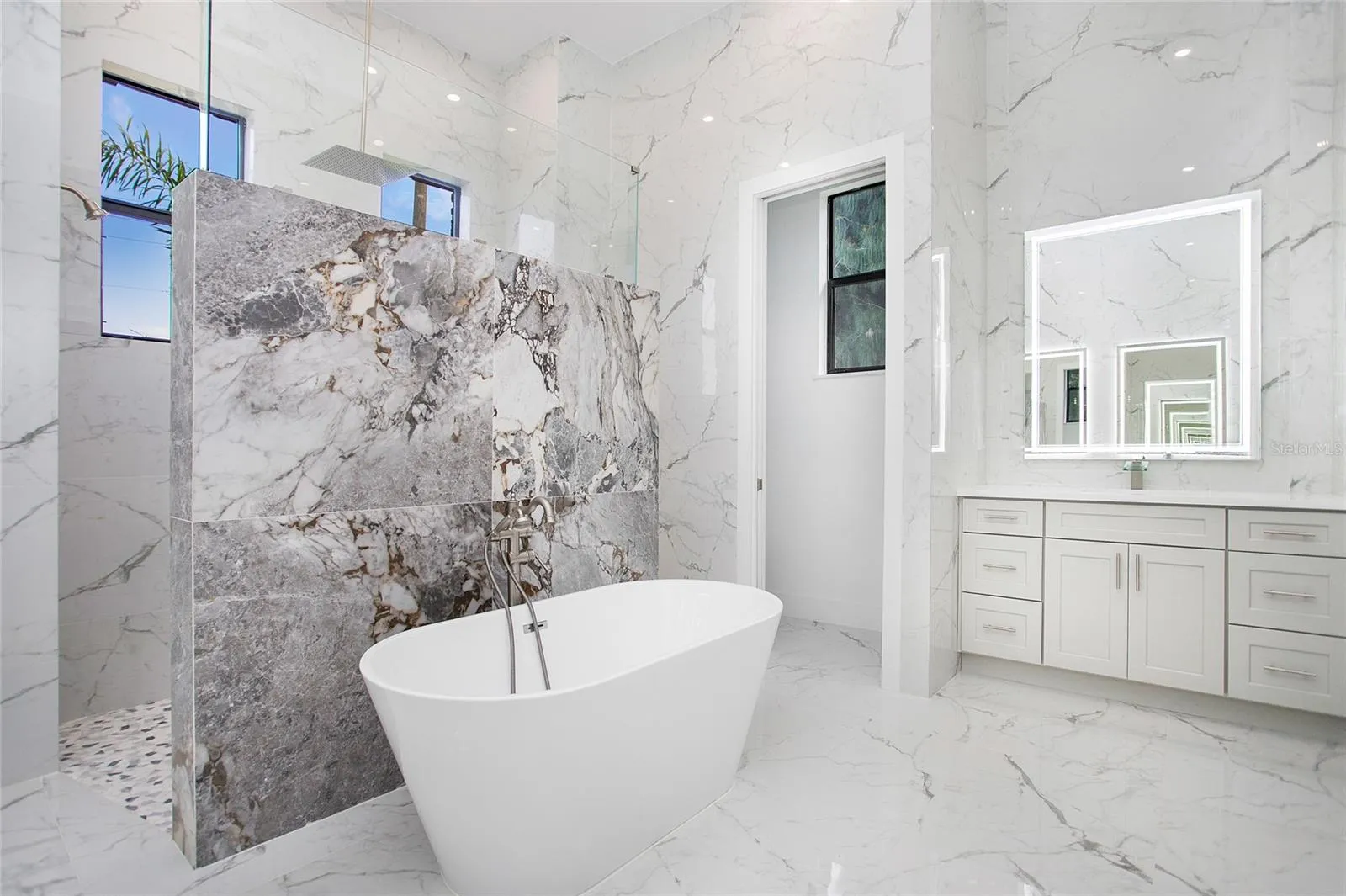 vanities, a soaking tub, multiple shower heads, and generous closet space. Set on a .21-acre lot, the home opens to a serene wooded backdrop