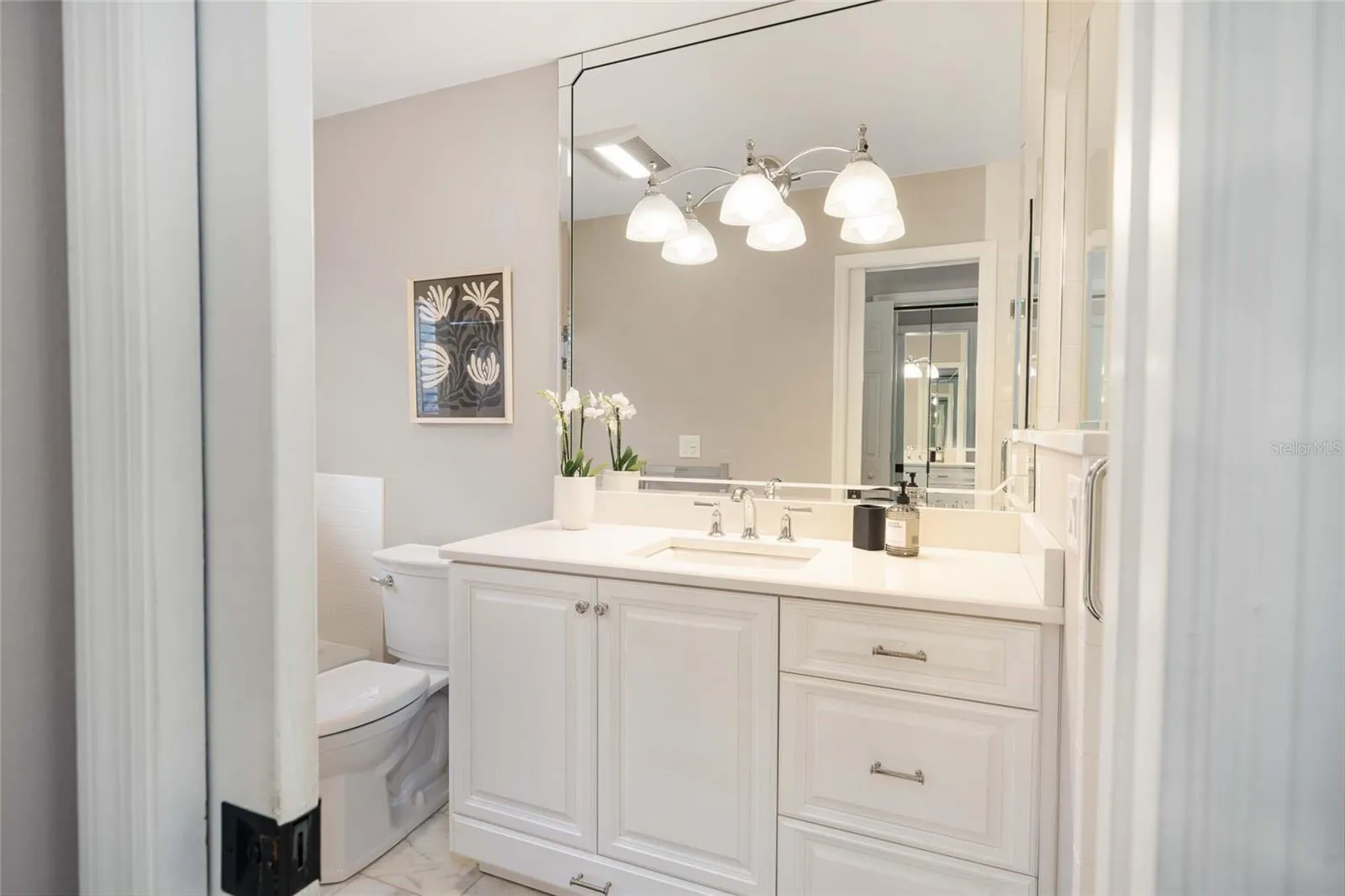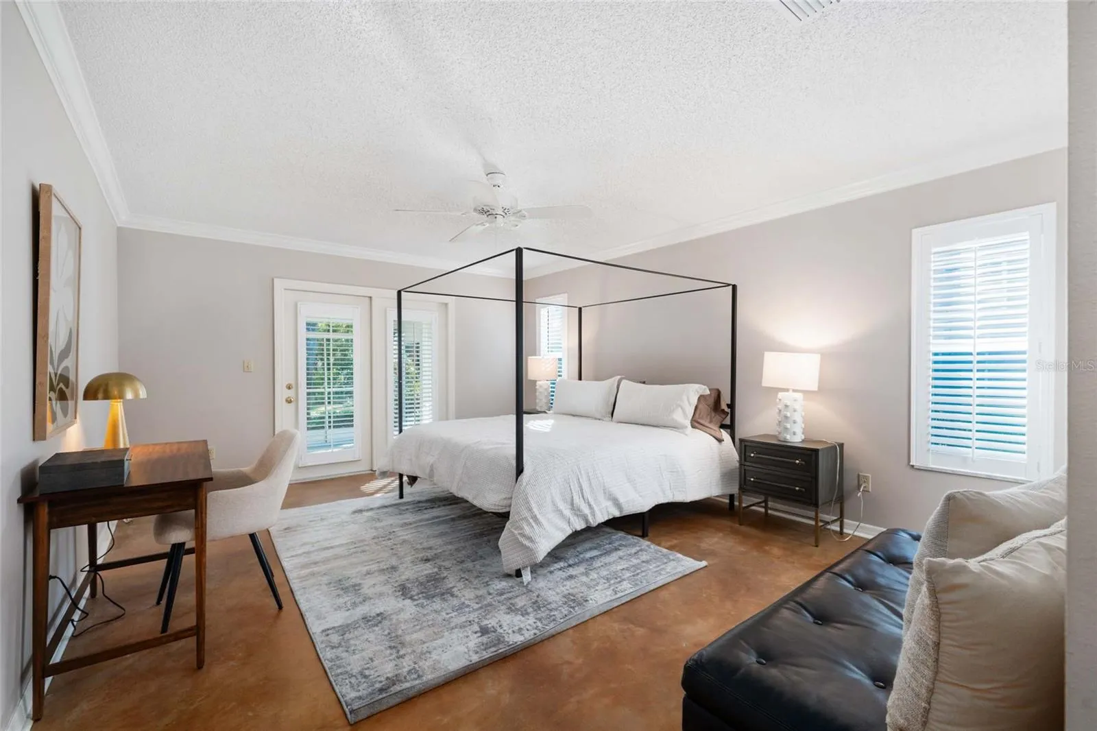 Experience unparalleled privacy with the split bedroom plan, placing the luxurious primary suite on the opposite end of the home. This generously sized primary bedroom offers a tranquil sanctuary, complete with direct access to your private screened-in back patio. Ample storage awaits in the ideal walk-in closet, perfect for all your apparel and belongings. The recently renovated en suite primary bathroom is a true indulgence, showcasing a stunning glass walk-in shower, a relaxing soaking tub, and a beautiful vanity.