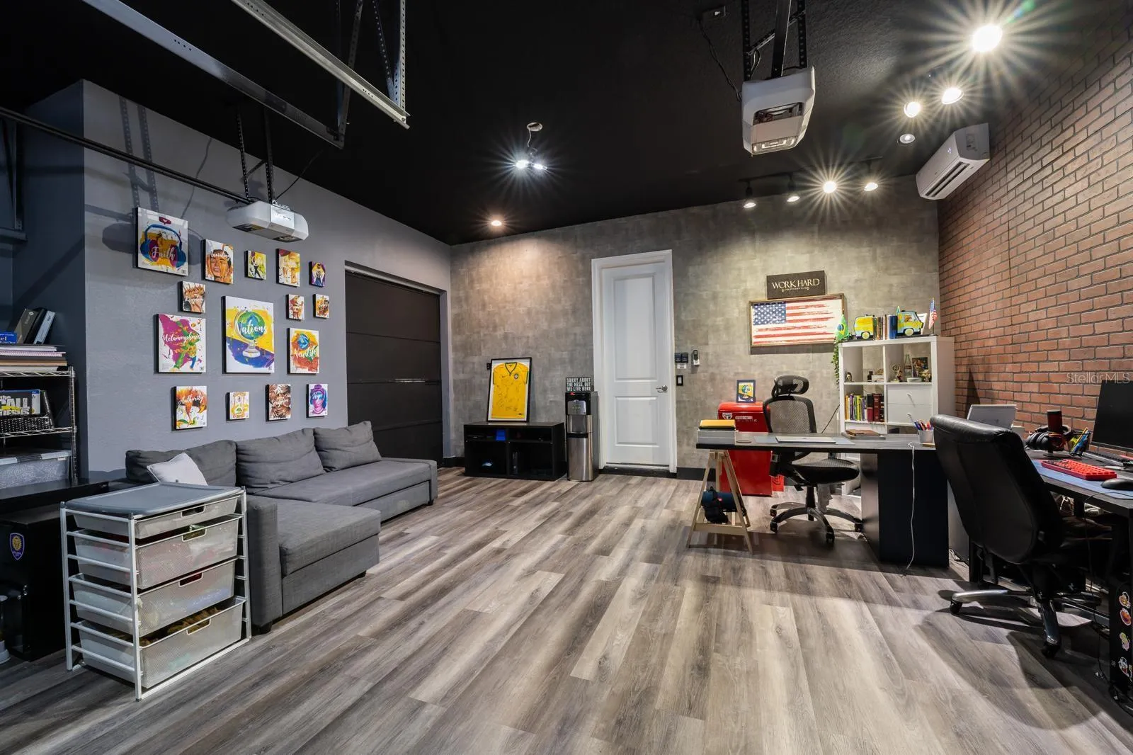 The two-car garage has been transformed into a game room, expanding leisure options within the home itself.