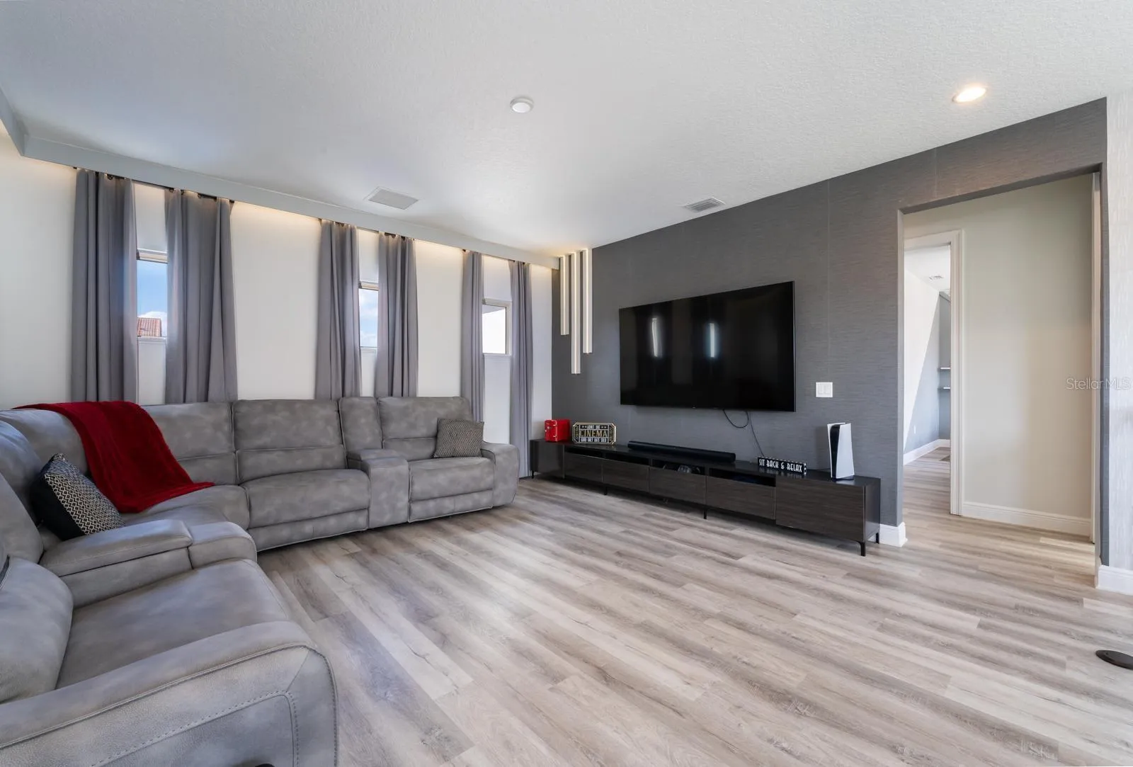 Upstairs, there are three generous bedrooms, two full bathrooms, and a mezzanine currently used as a media room, offering even more comfort and versatility.