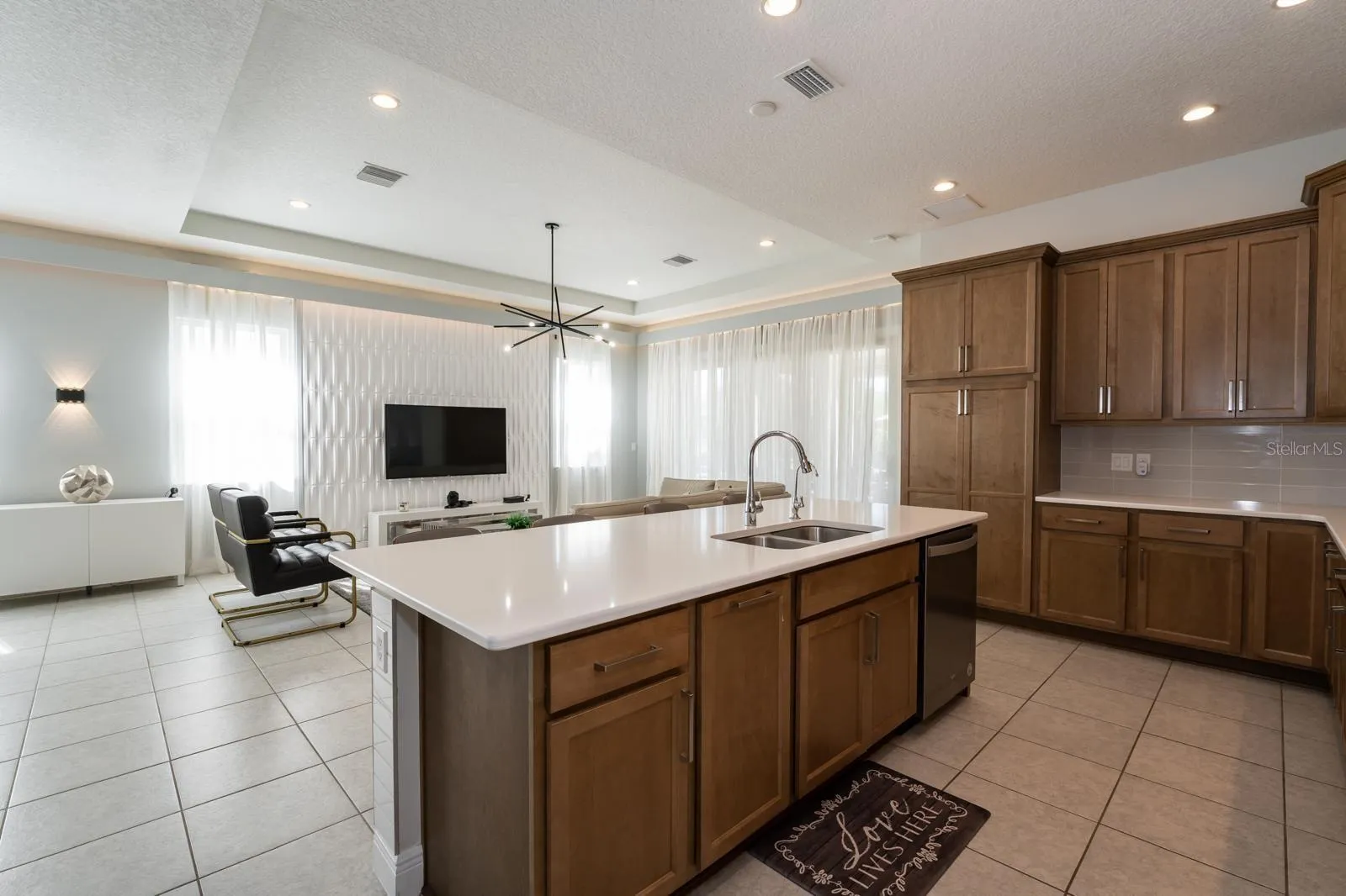 The gourmet kitchen, expertly designed, features ample countertops, a spacious island, and custom-designed wooden cabinets — ideal for those who appreciate functionality and beauty.