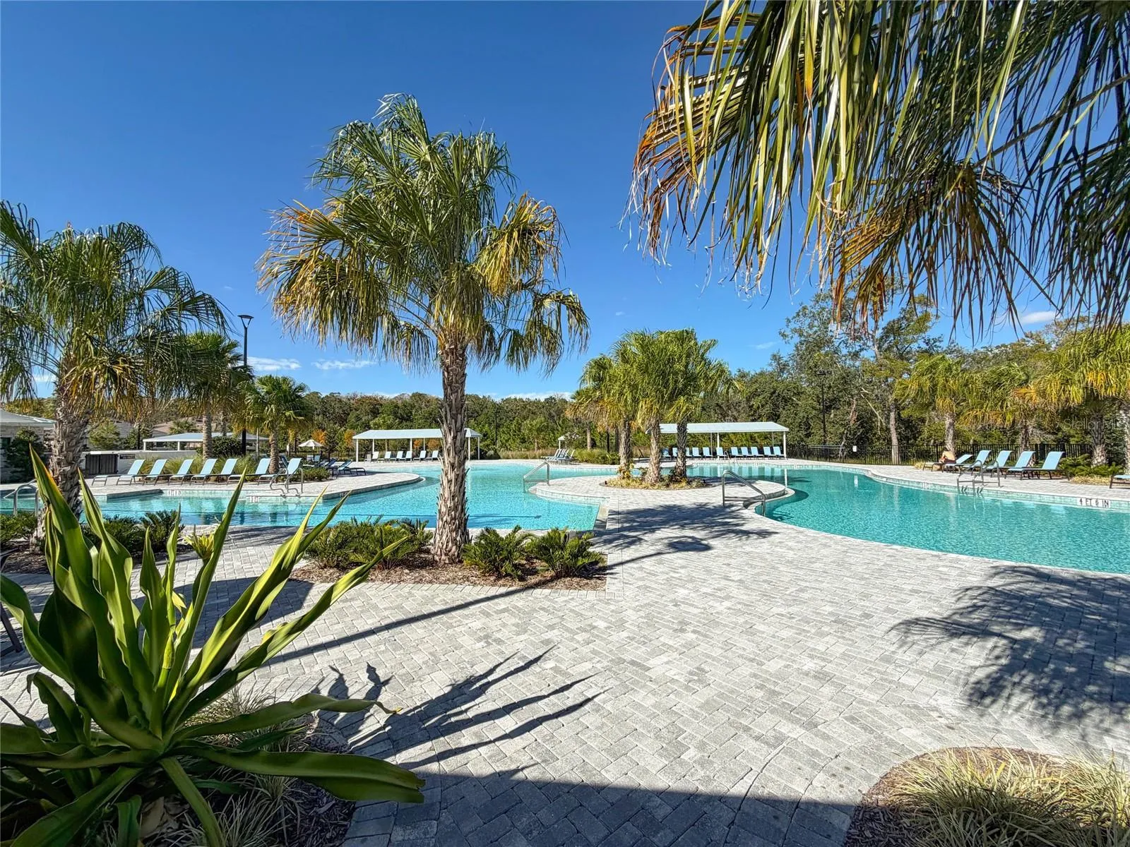 Beautiful 2 bedroom, 2 bath, 2 car garage home located in Active Adult Life Style 55+ community of Tampa Bay. Built in 2023. Open floor plan. Tile floors in living room, bathrooms, kitchen and carpet in both bedrooms. Three panel sliding door to Lanai. All two pane glass windows and most energy efficient air conditioner to keep your electric bills to the minimum. Quartz counter tops. Crown molding. Stainless steel appliances. Community club house has a snack bar, multiple swimming pools with pool bar, tennis courts, fitness center, pickleball, shuffleboard, bocce ball, and billiards. Inside are dedicated spaces for cards and poker, and a convenient dog-washing station. Elegant ballroom with music, shows, and themed gatherings featuring a rotation of talented entertainers brought in to create unforgettable experiences. Moffitt Cancer Center, set to open within the Angeline community in early 2026. Only about 30 minutes to Tampa International Airport. Enjoy resort style living, Florida Life style. Make an appointment to see this beautiful house. It may be the next place you’ll call Home.