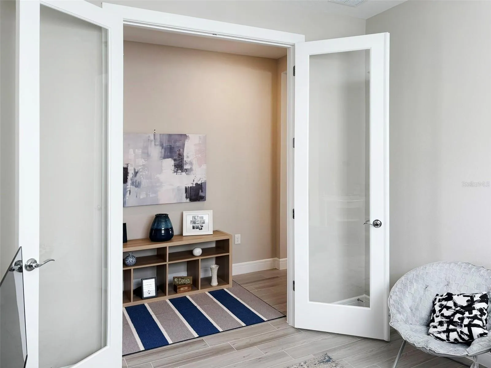 Also just off the entry with upgraded glass insert 8’ front door is the OFFICE/FLEX room, which also has 8’ glass french doors allowing for even more natural light to stream in. This makes a perfect office, den or extra space for guests. And speaking of guests, both you and your guests will appreciate this location.